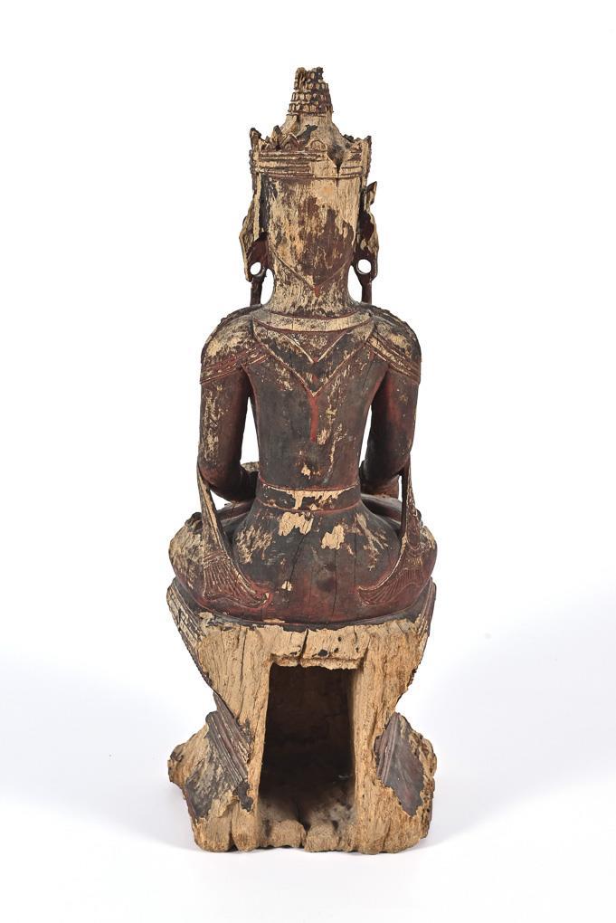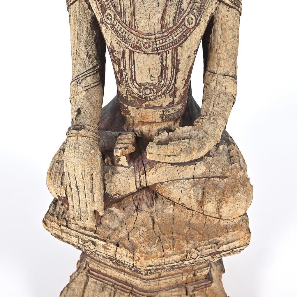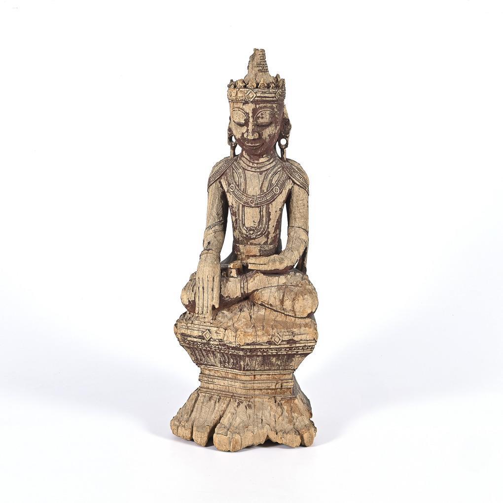Stärker verwitterte Figur eines sitzenden Buddhas mit der Geste der Erdberührung. Die Hände überproportional groß. Reste dunkelroter Farbfassung. Im hinteren Sockel leeres Reliquienfach. Größere Fehlstellen an Hand, der Sockelkante und der Krone.