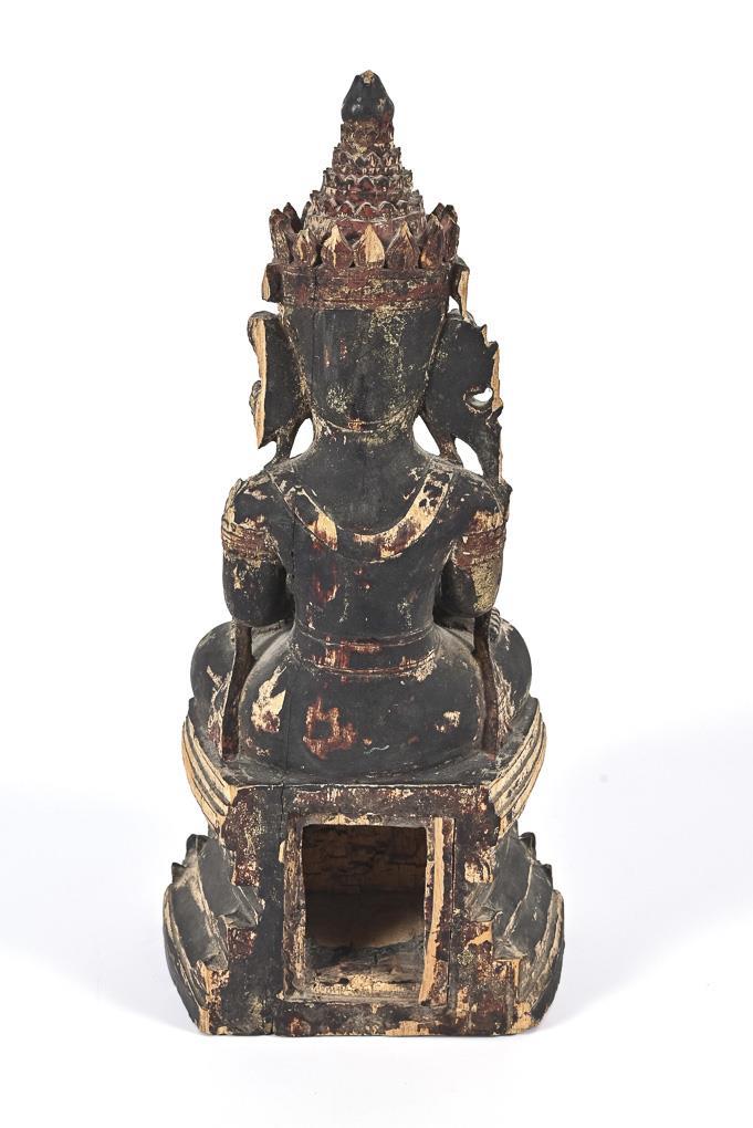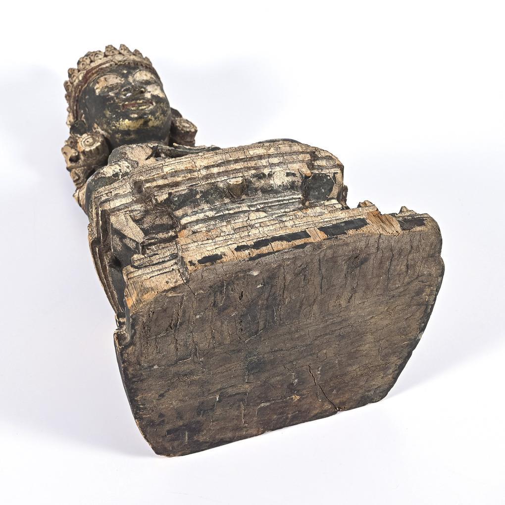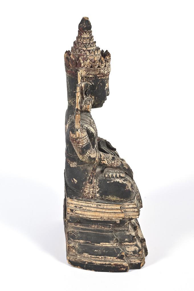 Sehr fein geschnitzte Figur, teils verwittert. Buddha mit der Geste der Erdberührung, in reich verzierter Bekleidung, mit Ohrringen und Kopfschmuck. Kleinere Fehlstellen, rückseitig leeres Sockelfach.