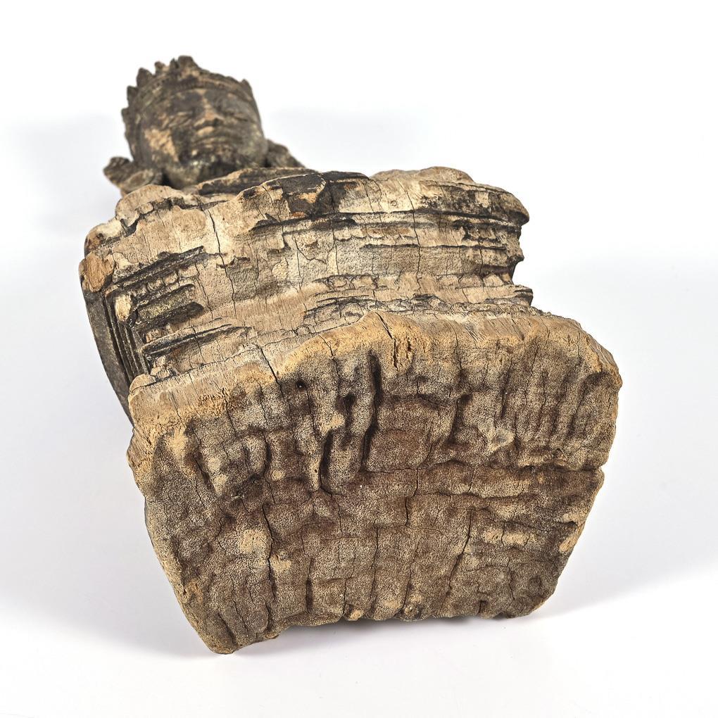 Fein geschnitzte Figur, teils verwittert, mit Resten goldener Farbfassung. Buddha mit der Geste der Erdberührung, in verzierter Bekleidung, mit Ohrringen und Kopfschmuck. Die Hände sind unproportional groß. Fehlstellen durch Verwitterung, besonders auf der Vorderseite und im Kronenbereich. Feine Trockenrisse.