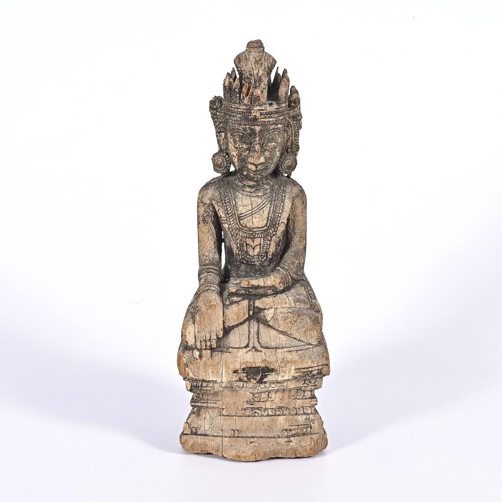 Fein geschnitzte Figur, teils verwittert, mit Resten goldener Farbfassung. Buddha mit der Geste der Erdberührung, in verzierter Bekleidung, mit Ohrringen und Kopfschmuck. Die Hände sind unproportional groß. Fehlstellen durch Verwitterung, besonders auf der Vorderseite und im Kronenbereich. Feine Trockenrisse.