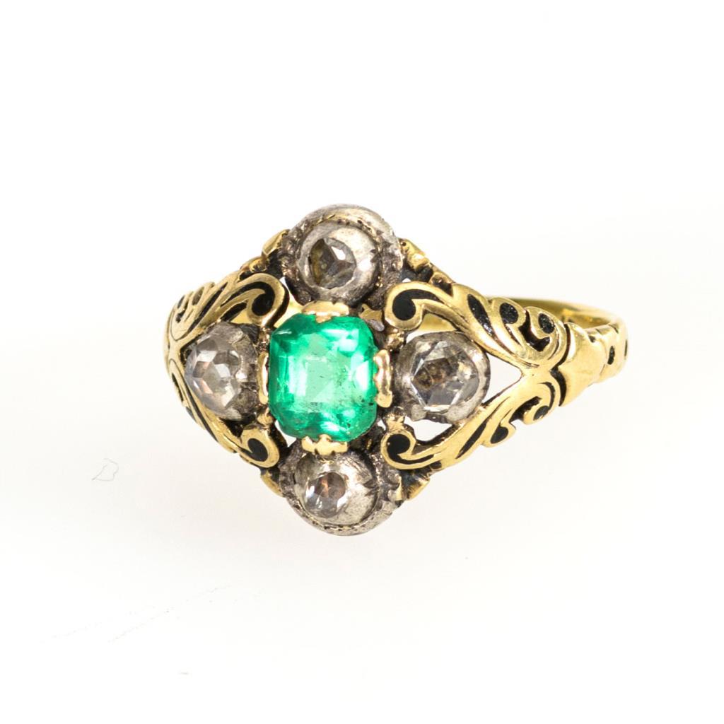 Smaragd (Facettenkanten berieben), umringt von 4 kleinen Diamanten in verziertem Ringkopf. Zarte Schiene.