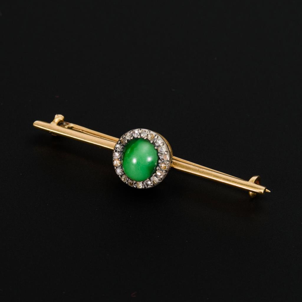Grüner Steincabochon, umringt von kleinen Rosendiamanten. Hakenverschluss.