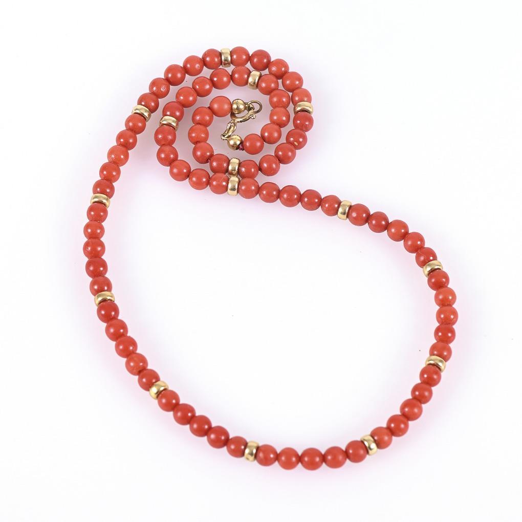 Schnürkette mit Korallenkugeln und Gelbgoldringen, an Ringfederschließe.
