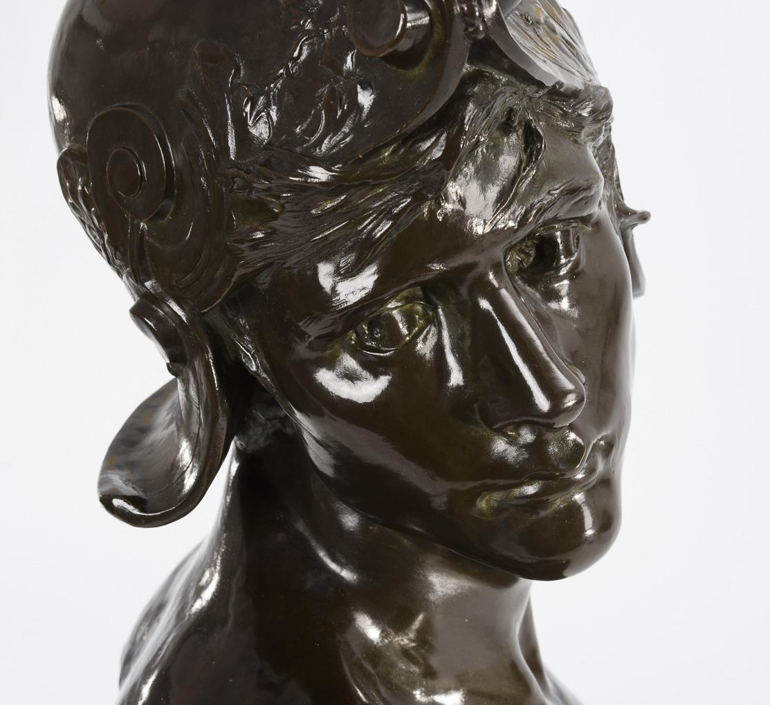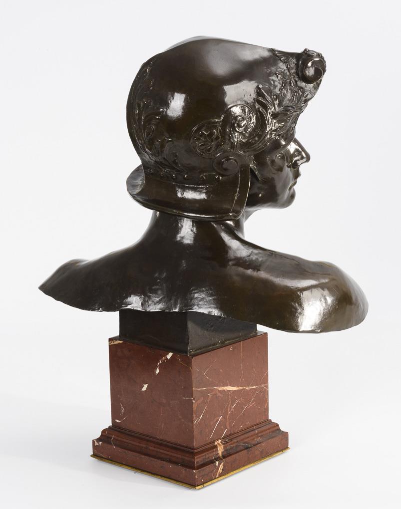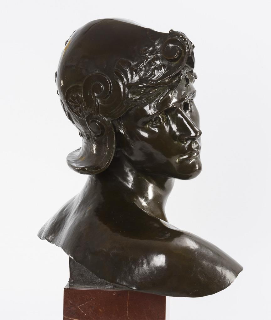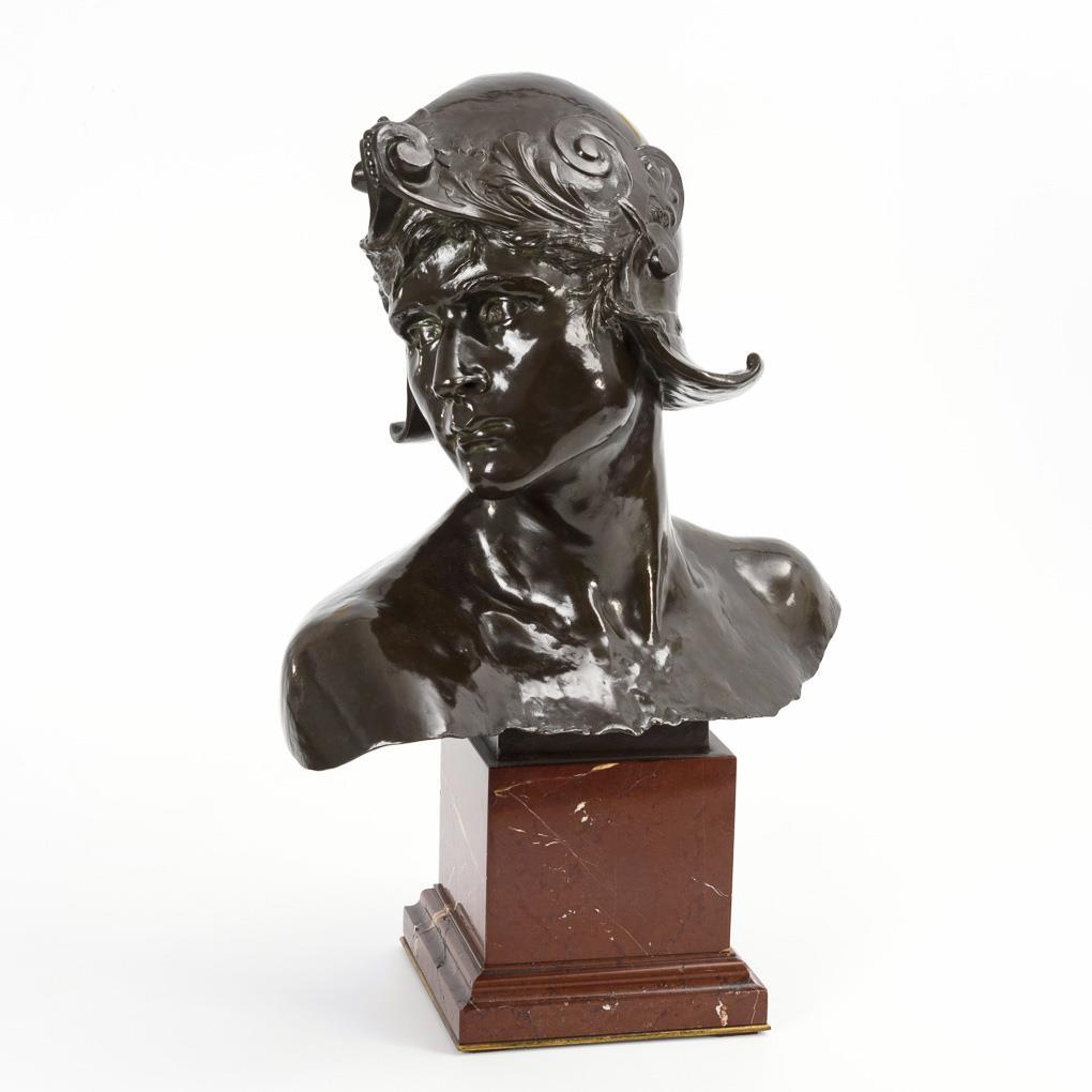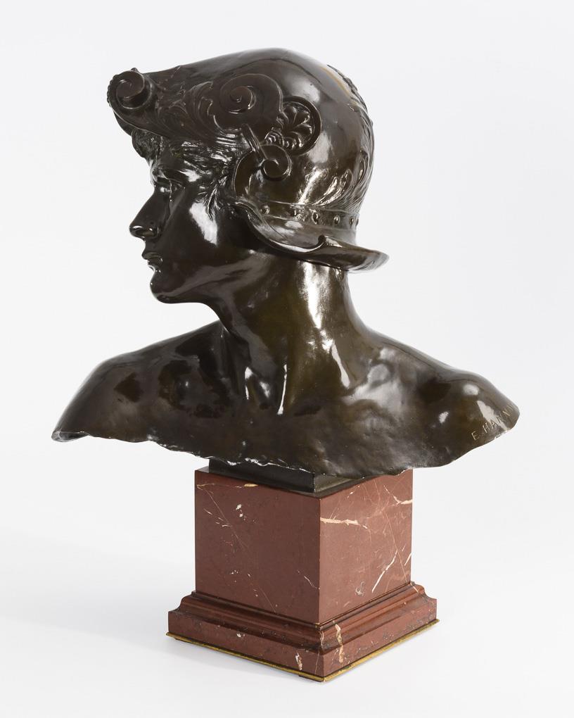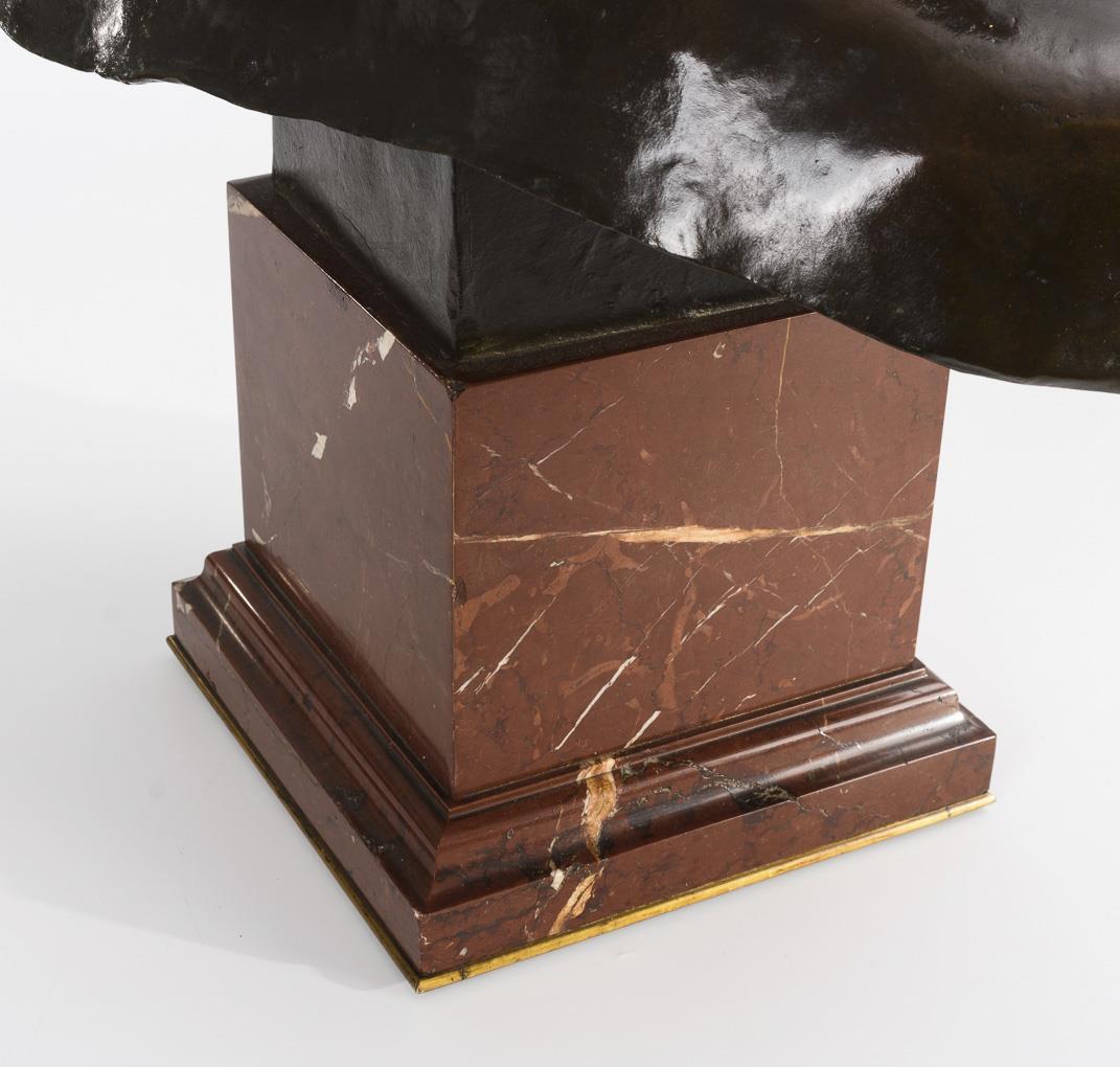 Bronze dunkel patiniert, roter Marmorsockel. Bezeichnet mit Datum "1894" und undeutliche Gießermarke "E. Colin & Cie Paris". H 38 / 56 cm.