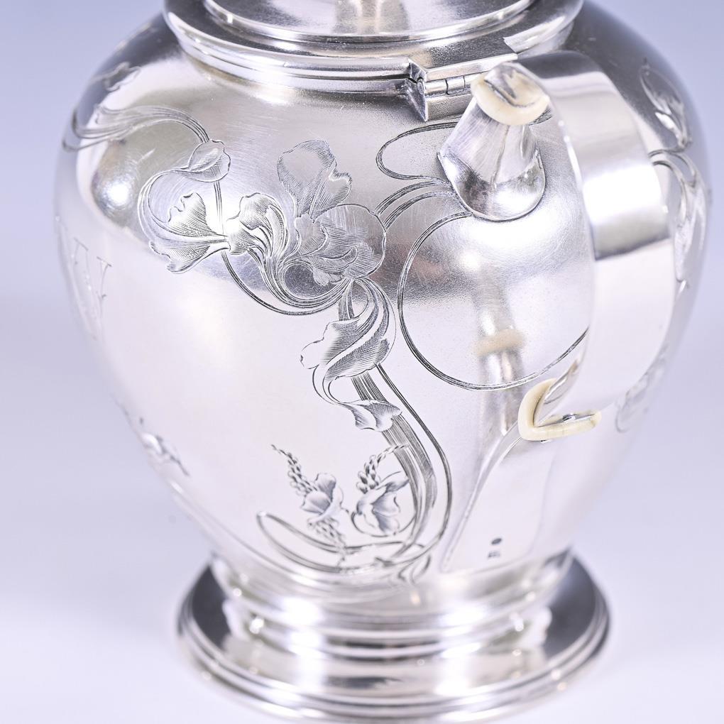Kleines, bauchiges Silberkännchen mit floraler Jugendstil-Gravur und römischer Zahl "XXV". Innen vergoldet.