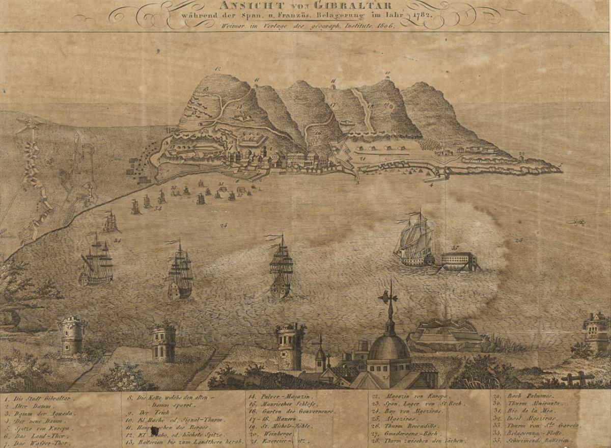 Historische Militärkarte: "Ansicht von Gibraltar während der Span. u. Französ. Belagerung im Jahr 1782. Weimar im Verlage des geograph. Instituts. 1806", mit Legende. Blatt mit starkem Lichtschaden, Bugfalten, Wasserschaden.