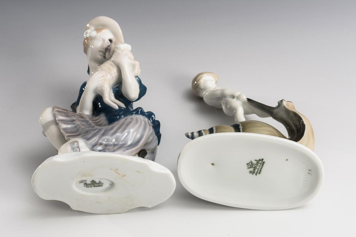 1x Modell-Nr. K 602, Entwurf A. Caasmann (1886-1968), 1921. H 13 cm. / 1x ohne Modell-Nr. Entwurf Karl Himmelstoss (1872-1967). H 15 cm. Kleiner Chip am Sockel der Frau.