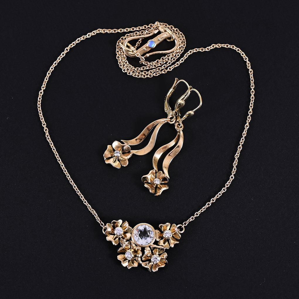 Schauteil mit zargengefasstem Aquamarin und 4 kleinen Brillanten, zwischen Ankerkette. Hakenverschluss mit kleinem Opalcabochon. Ohrhängerpaar mit kleinen Brillanten, an Federbügel.