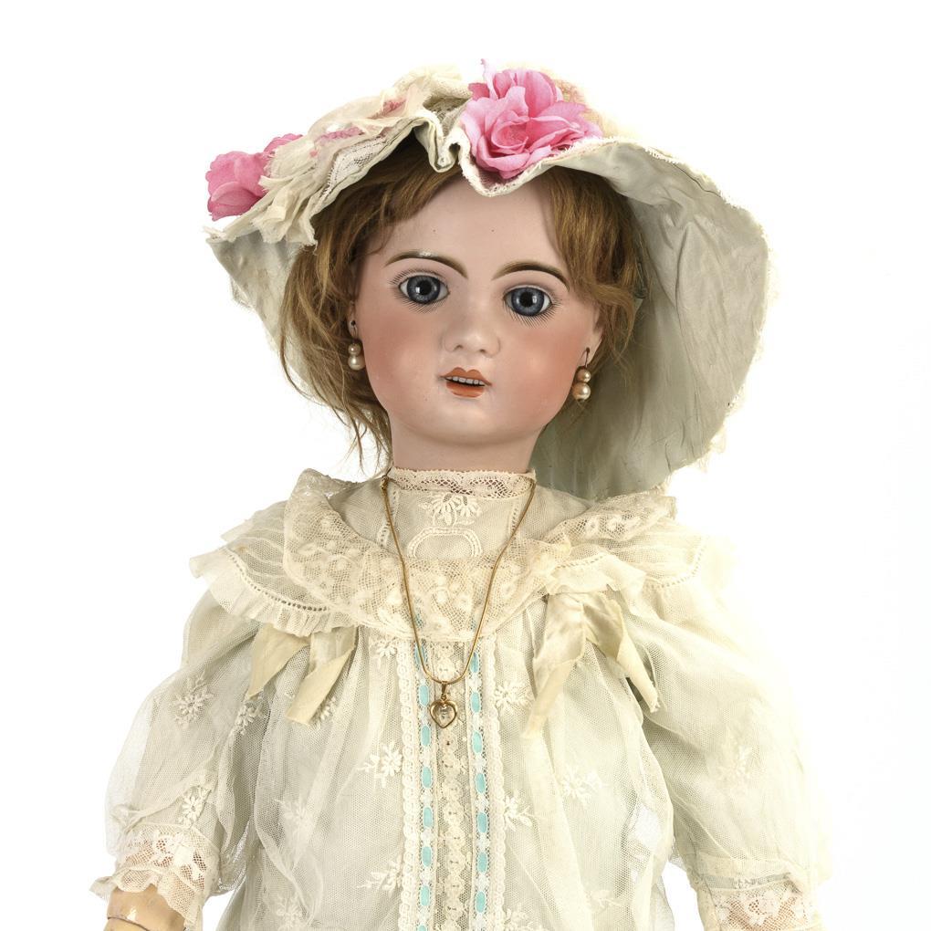 Kurbelkopf, Korkdeckel, feste blaue Paperweight-Augen, glasierte Zahnreihe, blonde Mohairperücke, Ohrringe. 11-teiliger Gliederkörper. Mintfarbenes Kleid mit alten Spitzen, passender Hut, weiße Stoffschuhe. Korkdeckel fest, Kopf nicht durchleuchtet: kleiner Chip am rechten Ohrloch. Körper mit kleinen Farbdefekten.