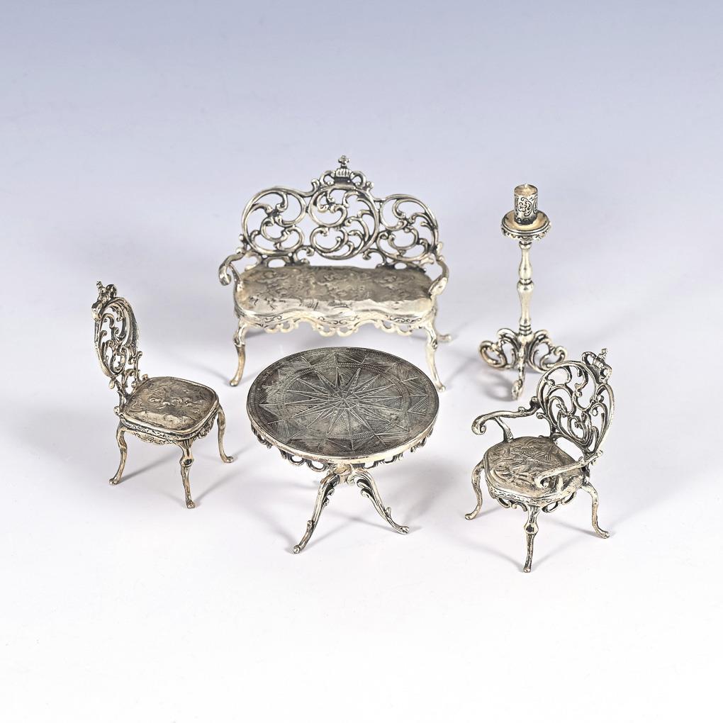 5 silberne Miniaturmöbel. Gebrüder Kühn, Schwäbisch Gmünd.