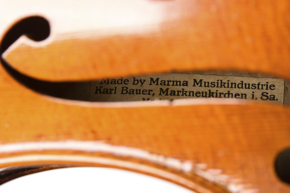 Innen gedruckter Klebezettel "Made by Marma Musikindustrie / Karl Bauer, Markneukirchen i.Sa. / Made in Germany". Innen Brandmarke "F.A.B.". BRÜCKNER, Fritz Arnold(1899 Markneukirchen, tätig noch in den 1980er Jahren ebd. und in Siebenbrunn )