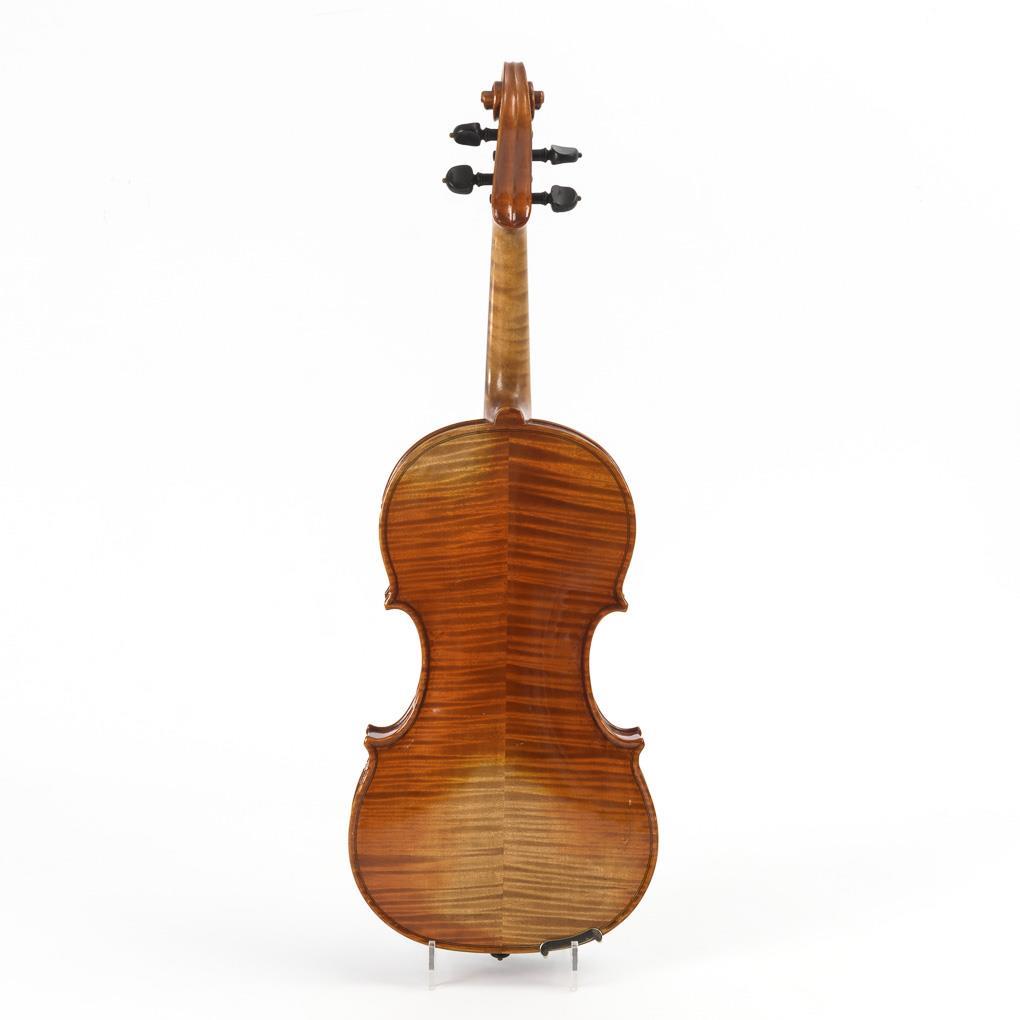 Geige nach einem Modell von Joseph Guarnerius del Gesu. Randeinlage aus 2 Fäden, Kinnstütze. Bogen mit runder Stange. Dazu Schulterstütze und verstellbares Stimmgerät. Im schwarzen Kasten. Minimale Lackschäden an Decke und Boden, sonst guter spielbereiter Zustand.