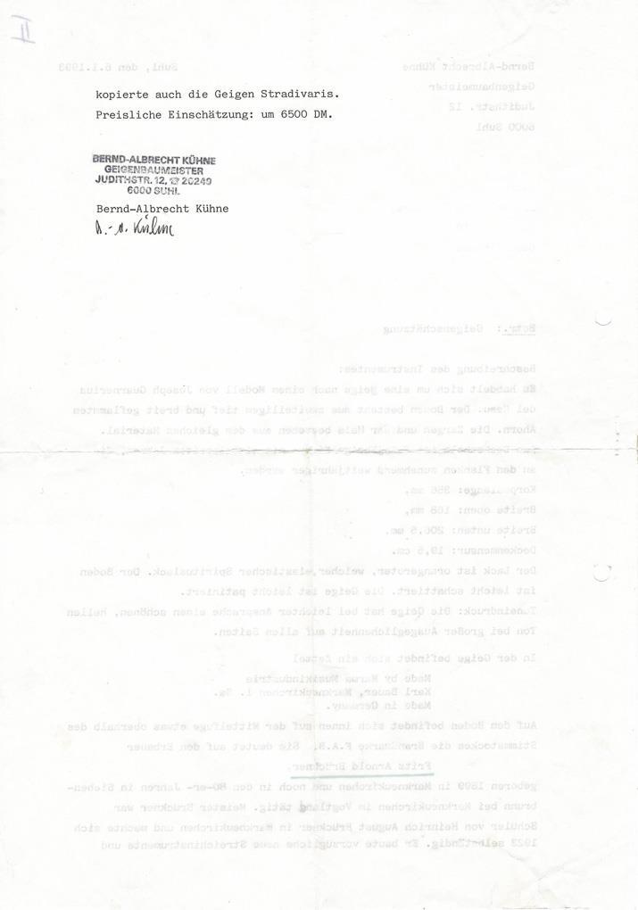 Meister F. A. Brückner war Schüler von Heinrich August Brückner in Markneukirchen und machte sich 1923 selbstständig. Er baute vorzügliche Streichinstrumente in moderner wie antiker Ausführung. Er kopierte auch die Geigen Stradivaris. Dazu Gutachten des Geigenbaumeisters Bernd-Albrecht Kühne in Suhl vom 6.1.1993.