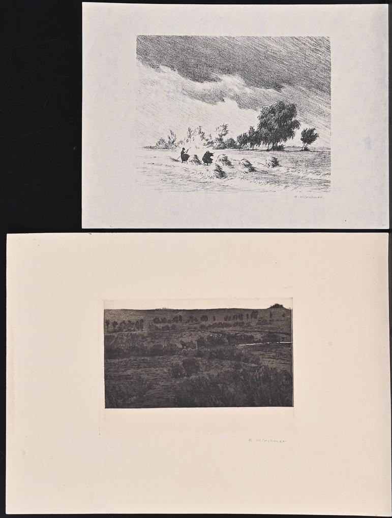 Heu ernten im Sturm, Platte: 15,5 x 19,5 cm, Blatt: 22,3 x 30,6 cm | Berggipfel, Platte: 13,2 x 20 cm, Blatt: 19,3 x 26,8 cm, [1916] | Landschaft mit Kirche, Platte: 17 x 11,5 cm, Blatt: 22,5 x 17,6 cm | Karge Landschaft, Radierung, Platte: 14 x 20,3 cm, Blatt: 28 x 38,5 cm. Je minimal knick- und griffspurig.