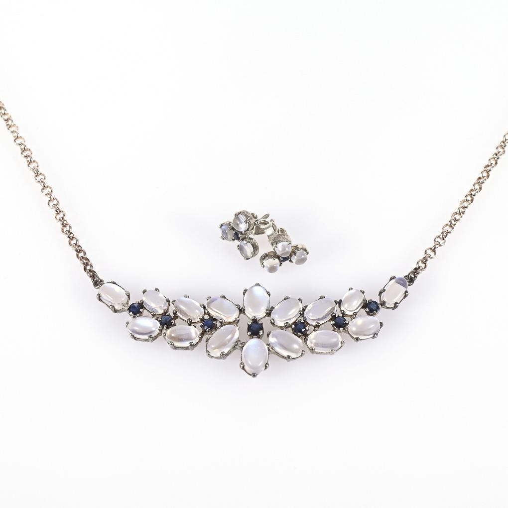 Collier und Ohrsteckerpaar mit Mondsteinen und Saphiren.