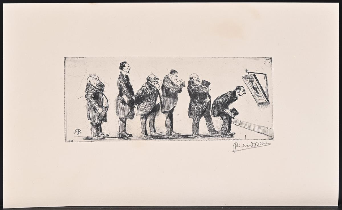 "Les pêcheurs" - Fischer an der Seine in Paris: Radierung, Platte: 12,7 x 22,7 cm, Blatt: 20,7 x 27,2 cm, in der Platte signiert | Herren im Museum: Radierung, Bleistiftsignatur, Platte: 11,5 x 28,7 cm, Blatt: 28,5 x 46,3 cm, etwas stockfleckig.