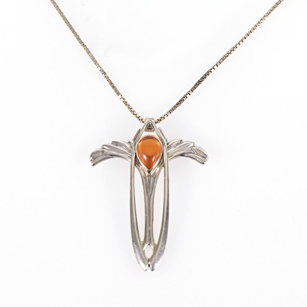 In Jugendstilart gestalteter Anhänger mit zargengefasstem Cabochon, an Venezianerkette mit Ringfederschließe.