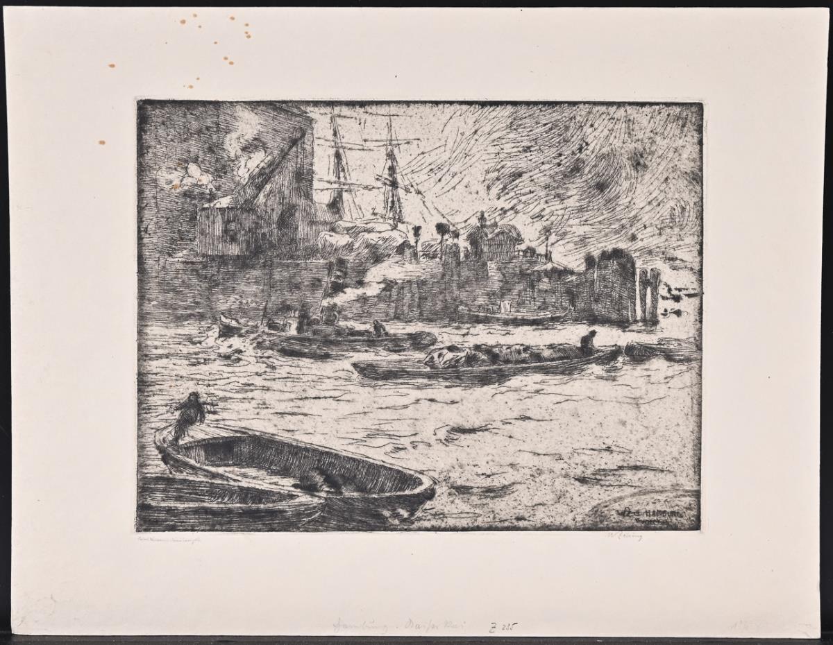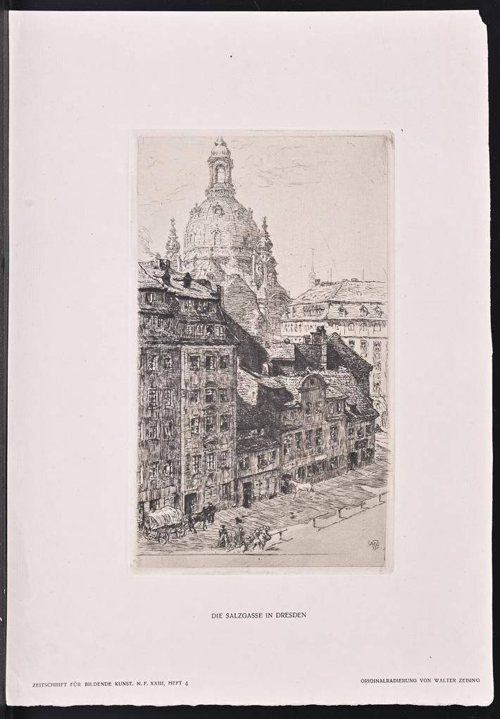 "Die Salzgasse in Dresden", Platte: 22 x 13,2 cm, Blatt: 34 x 24 cm, typografisch bezeichnet "Zeitschrift für Bildende Kunst, N.F. XXIII, Heft 4, Originalradierung von Walter Zeising" | "Hamburg Kaiser Kai", Platte: 19,5 x 24,5 cm, Blatt: 27,5 x 34,7 cm | Theaterplatz Dresden im Winter, Platte: 22,5 x 27,7 cm, Blatt: 26,5 x 37 cm. Je etwas knickspurig, 1x minimal stockfleckig.