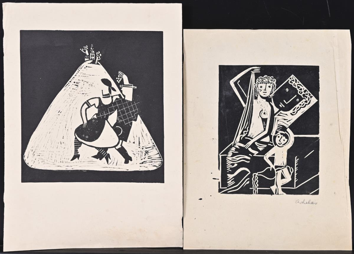 Tanzendes Paar in Tracht: Druckstock: 22 x 20 cm, Blatt: 35 x 25 cm, untere linke Ecke mit Knick, unterer Randbereich griffspurig | Mythologische Szene?: Druckstock: 18,5 x 14 cm, Blatt: 31,5 x 23,5 cm, Bleistiftsignatur "Adeler"?, rechter Rand stärker geknickt.