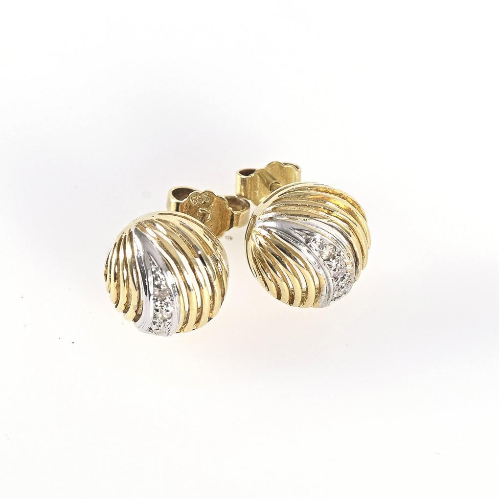 Halbkugelige Brisuren mit je 3 kleinen, eingelassenen Diamanten. Steckmechanik.