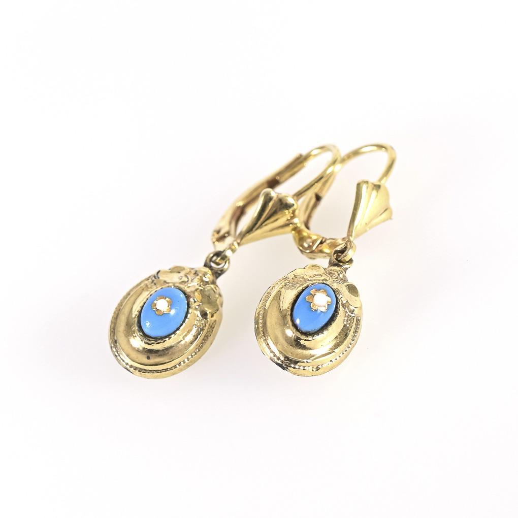 Reliefierte Abhängungen mit kleinen Glascabochons, an Federbügeln.