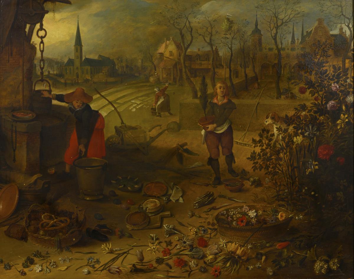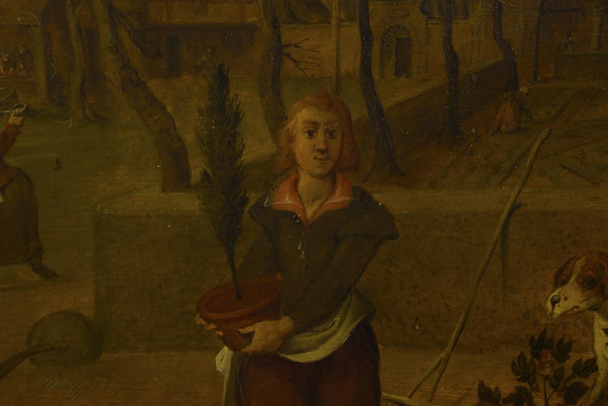 Stadtansicht mit arbeitendem Volk in den Gärten oder am Brunnen sowie winterliche Stadtszene mit Personen beim Schneeball werfen und einem Mann am Kamin unter löchrigem Dach. Leichte Altersspuren.
