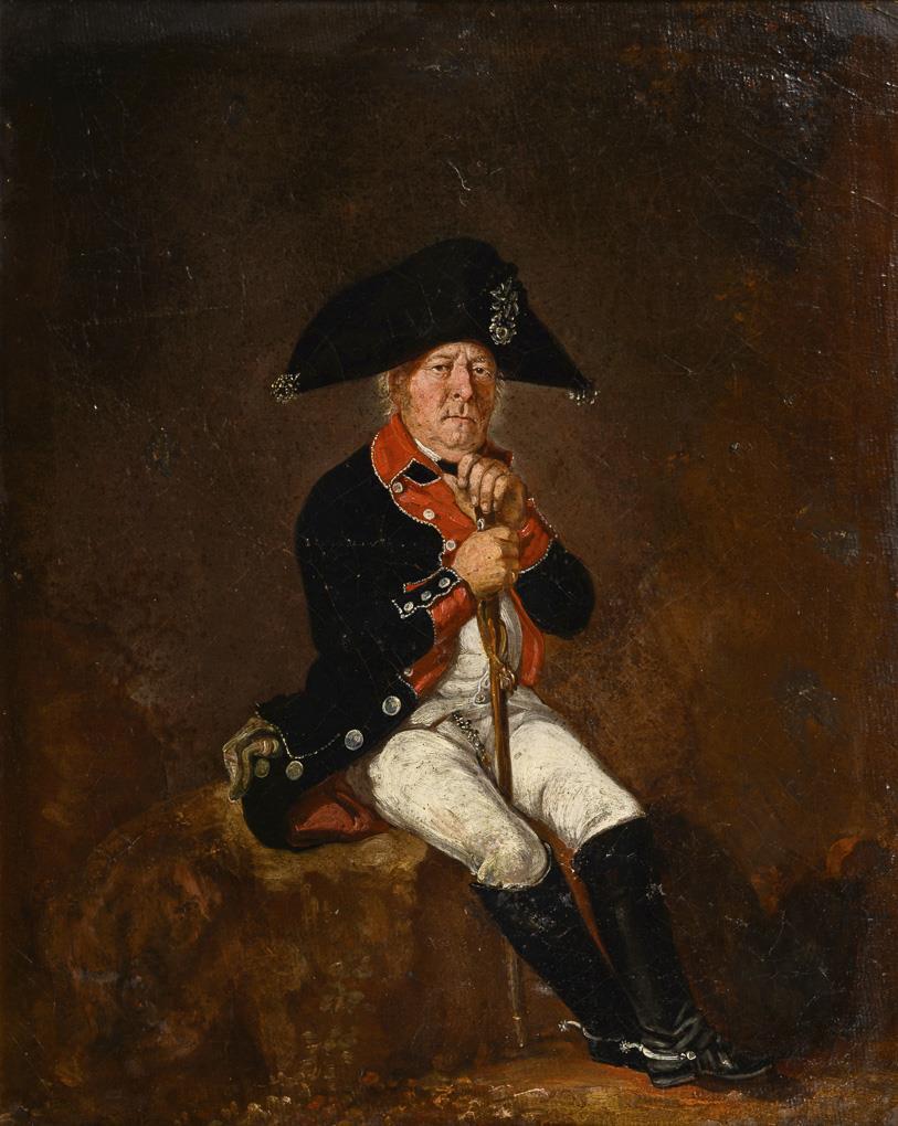 Qualitätvolles Porträt eines älteren Offiziers in preußischer Uniform auf einem Felsen sitzend. Restauriert mit Hinterklebungen.