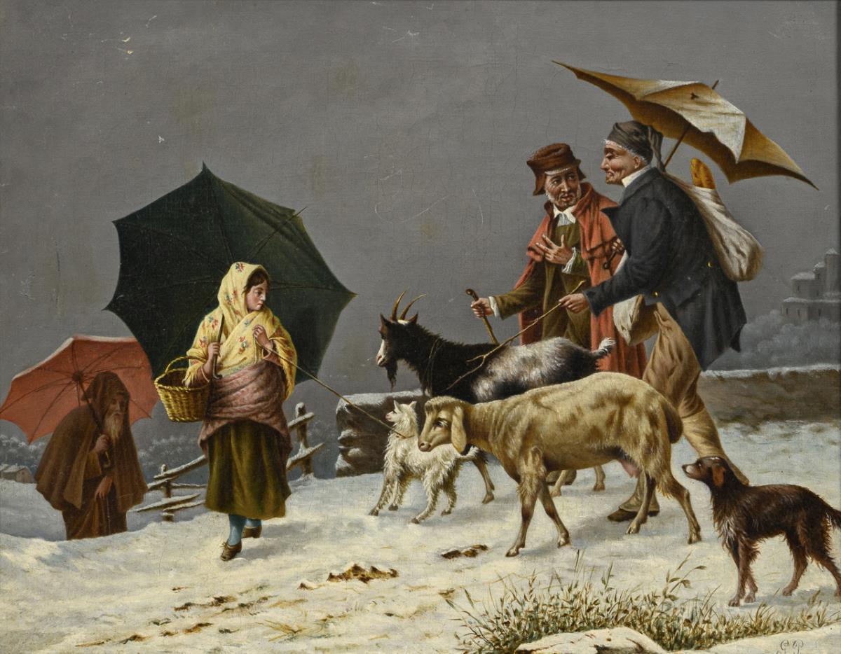 Verschiedene Personen auf verschneiter Straße mit dem Vieh unter grauem Himmel. Leinwand doubliert.