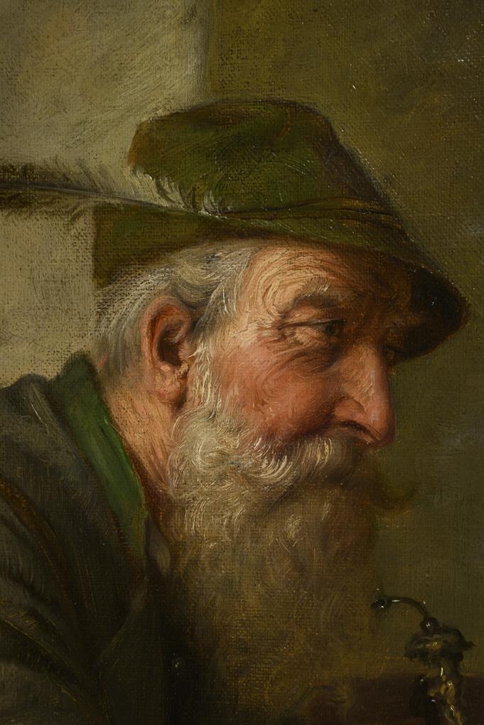 Zwei Jäger und der Wirt in alpenländischer Kleidung bei Schinken und Bier im Gespräch an einem Tisch. Minimale Altersspuren.