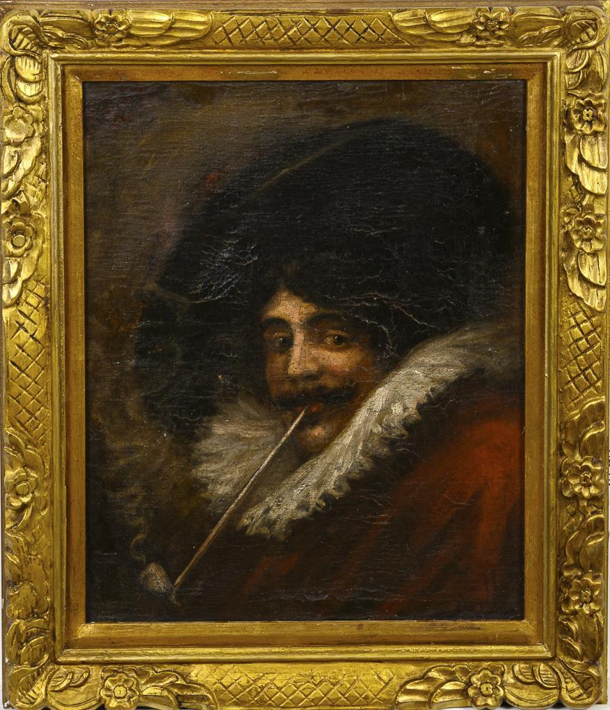Verschmitzt zum Betrachter blickender Mann mit langstieliger Pfeife in der Kleidung des 17. Jh. Altersspuren.