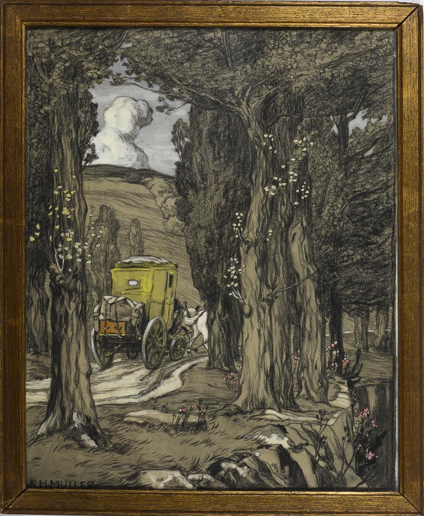 Kohlezeichnung mit Weißhöhung und Kreide. Kohlesignatur.