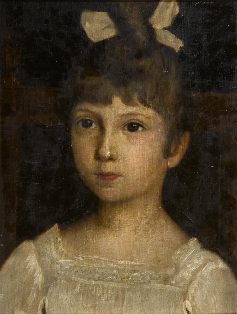 Porträt eines Mädchens im weißen Kleid und mit weißer Schleife im Haar. Altersspuren.