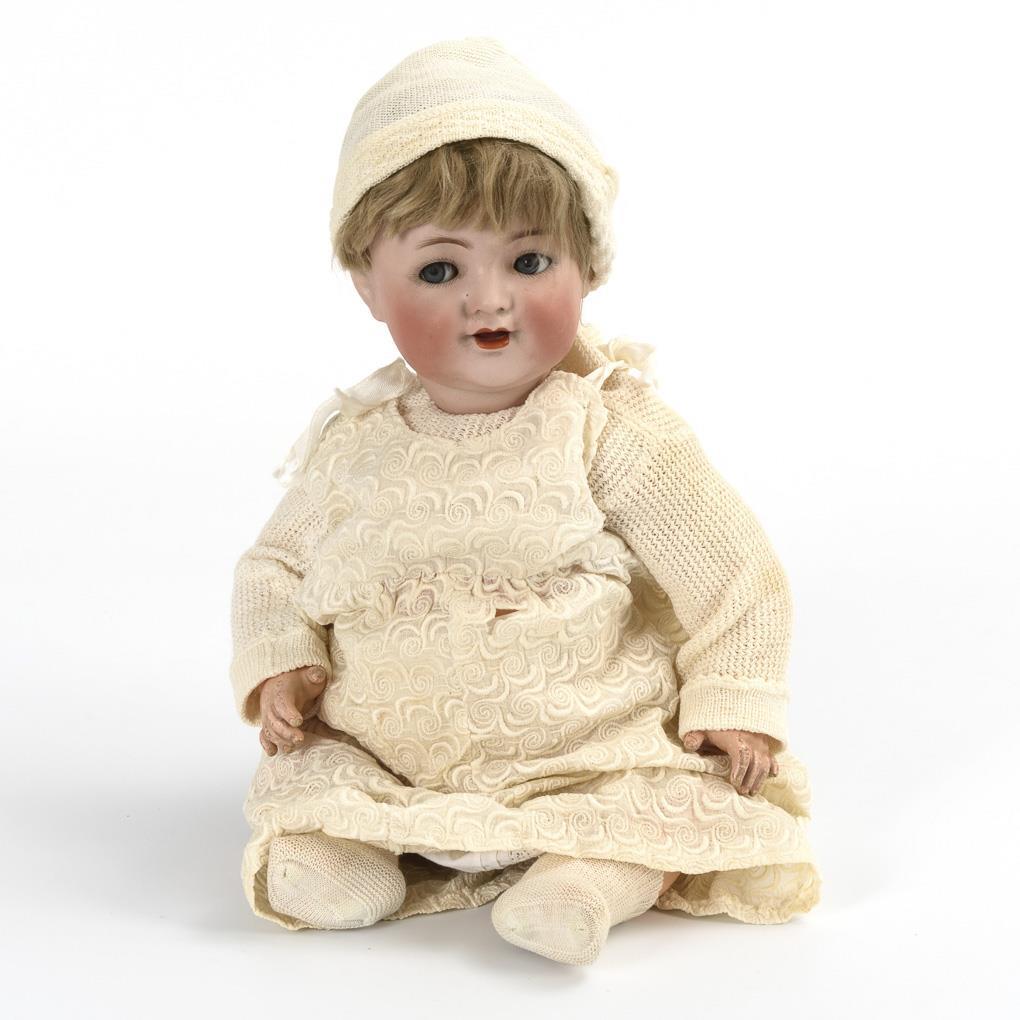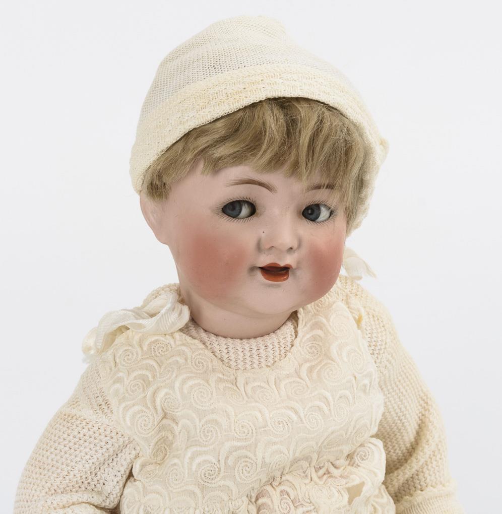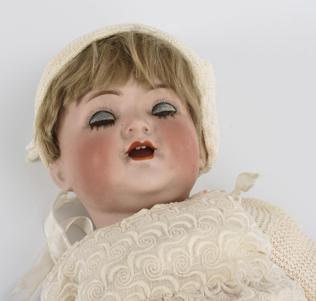 Blonde Mädchenpuppe (AM 1894) mit Kurbelkopf, blauen Schlafaugen, Echthaarperücke, 13-teiligem Gliederkörper, weiß-rot gestreiftem Kleid und weißen Schuhen. L 46 cm. / "Mein Lieblingsbaby" (K & R 126) mit Kurbelkopf, blauen Schlaf-/Schelmenaugen, 5-teiligem Sitzbabykörper, weißer Kleidung und Mütze. L 45 cm. Köpfe durchleuchtet: ohne Defekte, lediglich Mädchenpuppe mit Perückenpull und 1 defektem Finger.