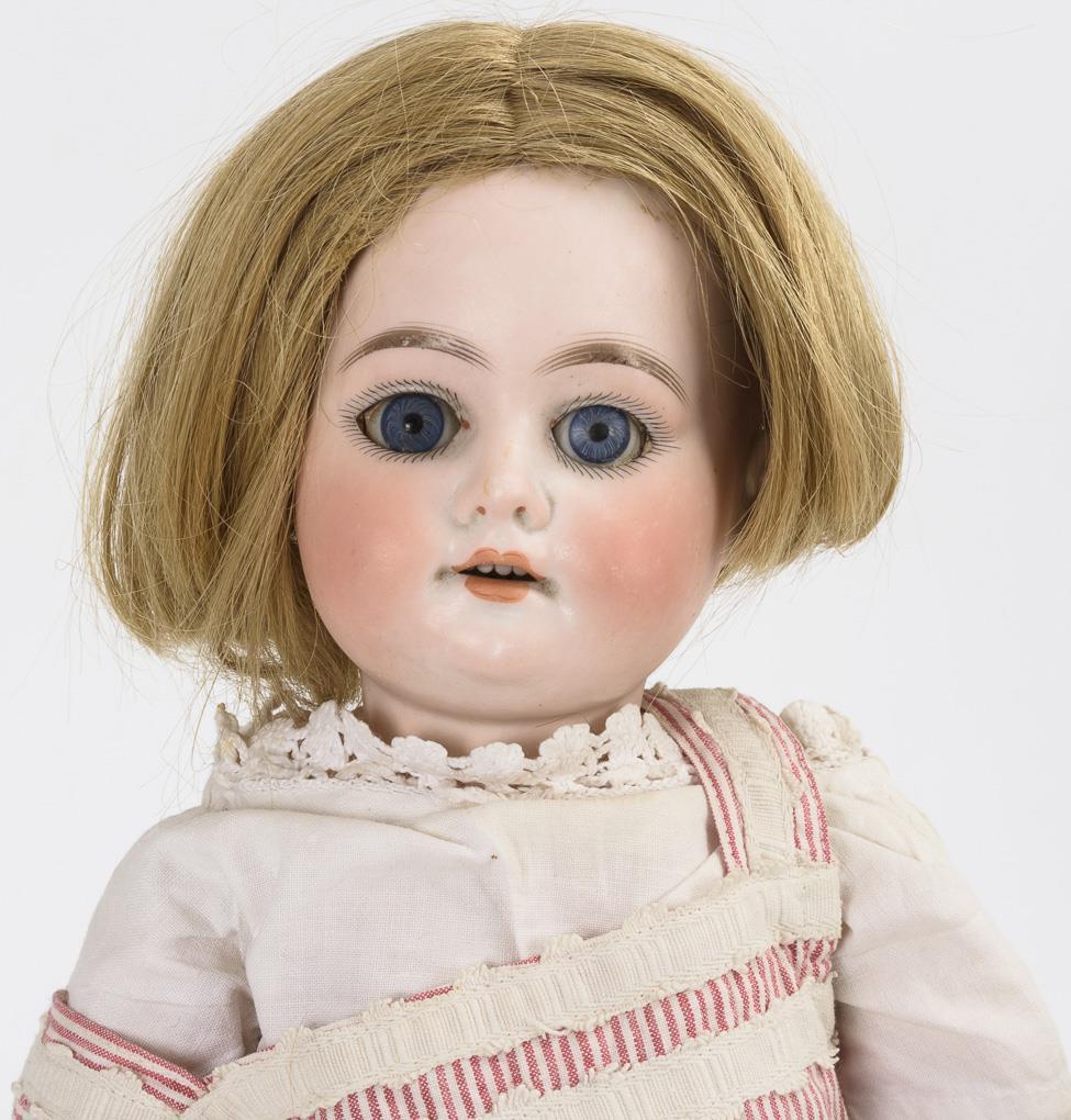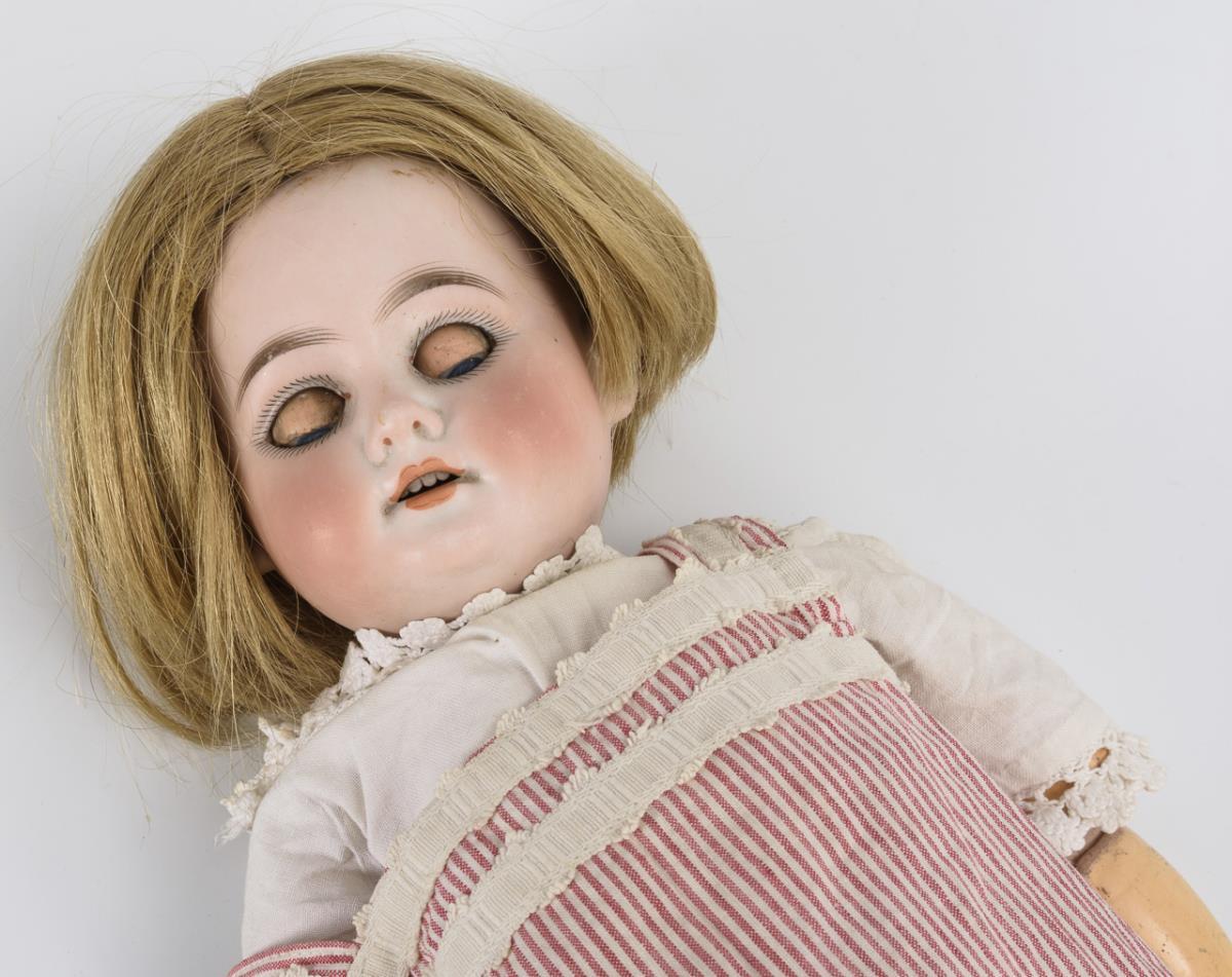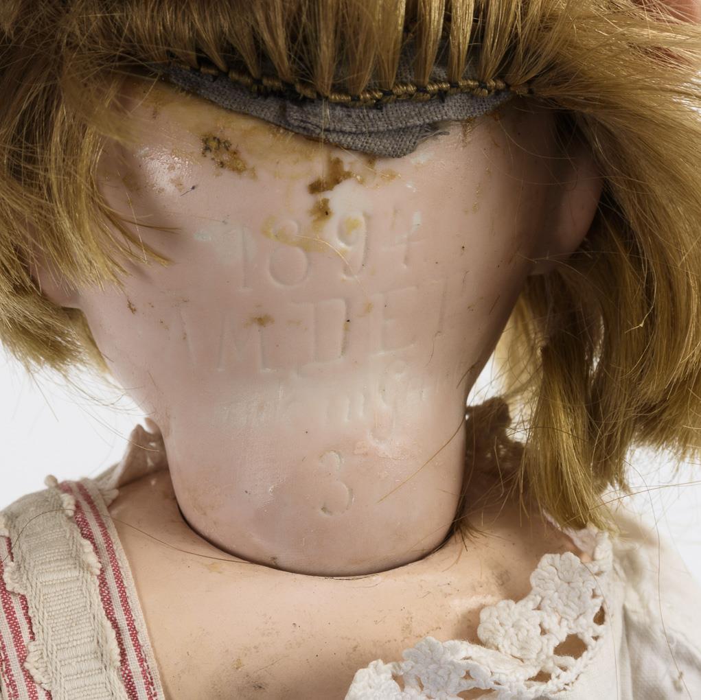 Blonde Mädchenpuppe (AM 1894) mit Kurbelkopf, blauen Schlafaugen, Echthaarperücke, 13-teiligem Gliederkörper, weiß-rot gestreiftem Kleid und weißen Schuhen. L 46 cm. / "Mein Lieblingsbaby" (K & R 126) mit Kurbelkopf, blauen Schlaf-/Schelmenaugen, 5-teiligem Sitzbabykörper, weißer Kleidung und Mütze. L 45 cm. Köpfe durchleuchtet: ohne Defekte, lediglich Mädchenpuppe mit Perückenpull und 1 defektem Finger.