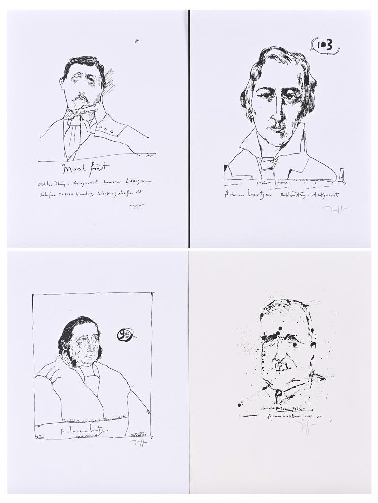 Marcel Proust, Heinrich Heine, Heinrich Mann und Adalbert Stifter aus der Serie "Dichterköpfe" für die Buchhandlung Hermann Laatzen.
