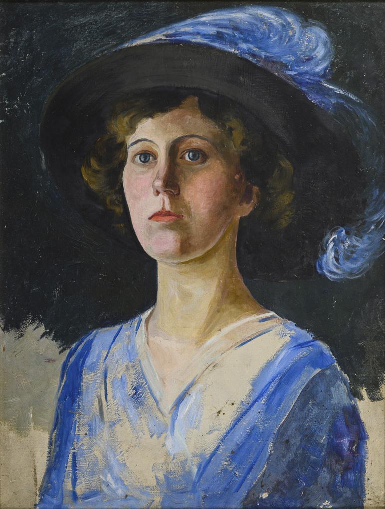 Porträt einer jungen Frau im blauen Kleid mit großem Hut.