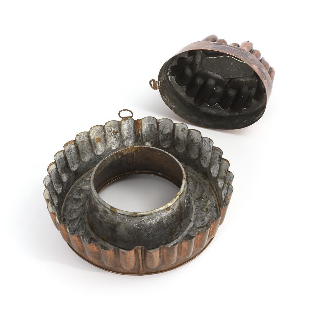 Ovale englische Geleeform aus Kupfer (jelly mould). / Backform mit gerippter Wandung. Geleeform wenige Haarrisse und 1 kleine Lötreparatur, Backform leichte Korrosionsspuren.