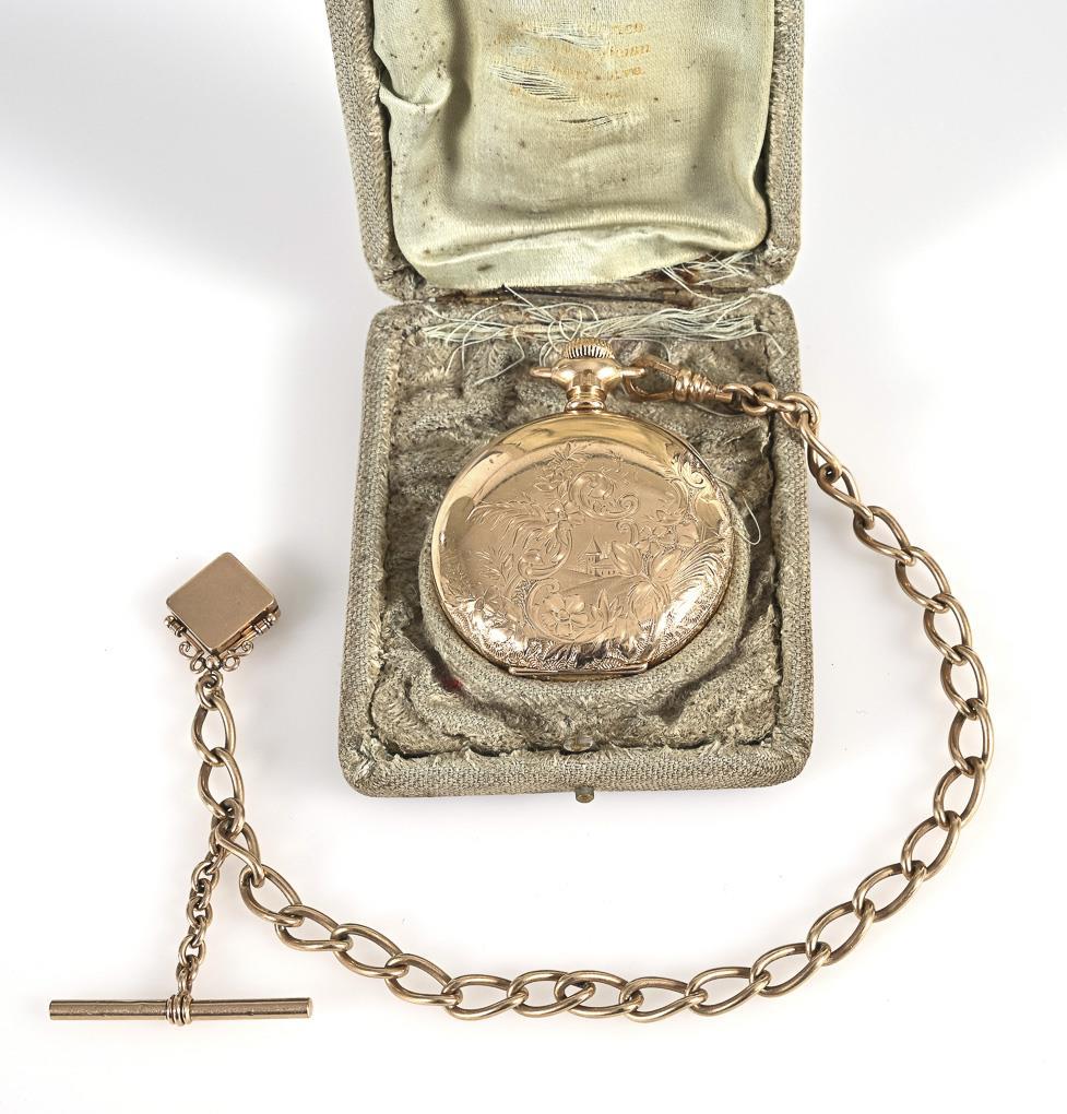 Elegante Savonnette mit Kette in Etui. ELGIN International Watch Co.