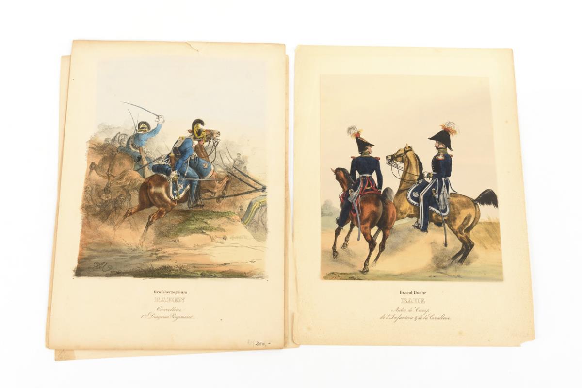 4x Baden, 4x Nassau und 2x Würtemberg (Württemberg). Soldaten und Offiziere in Uniformen; teils im Kampf. Alle Blätter bezeichnet, teils in französischer Sprache . Unterschiedliche Papierqualitäten, teils beschnitten und auf Trägerpapier.