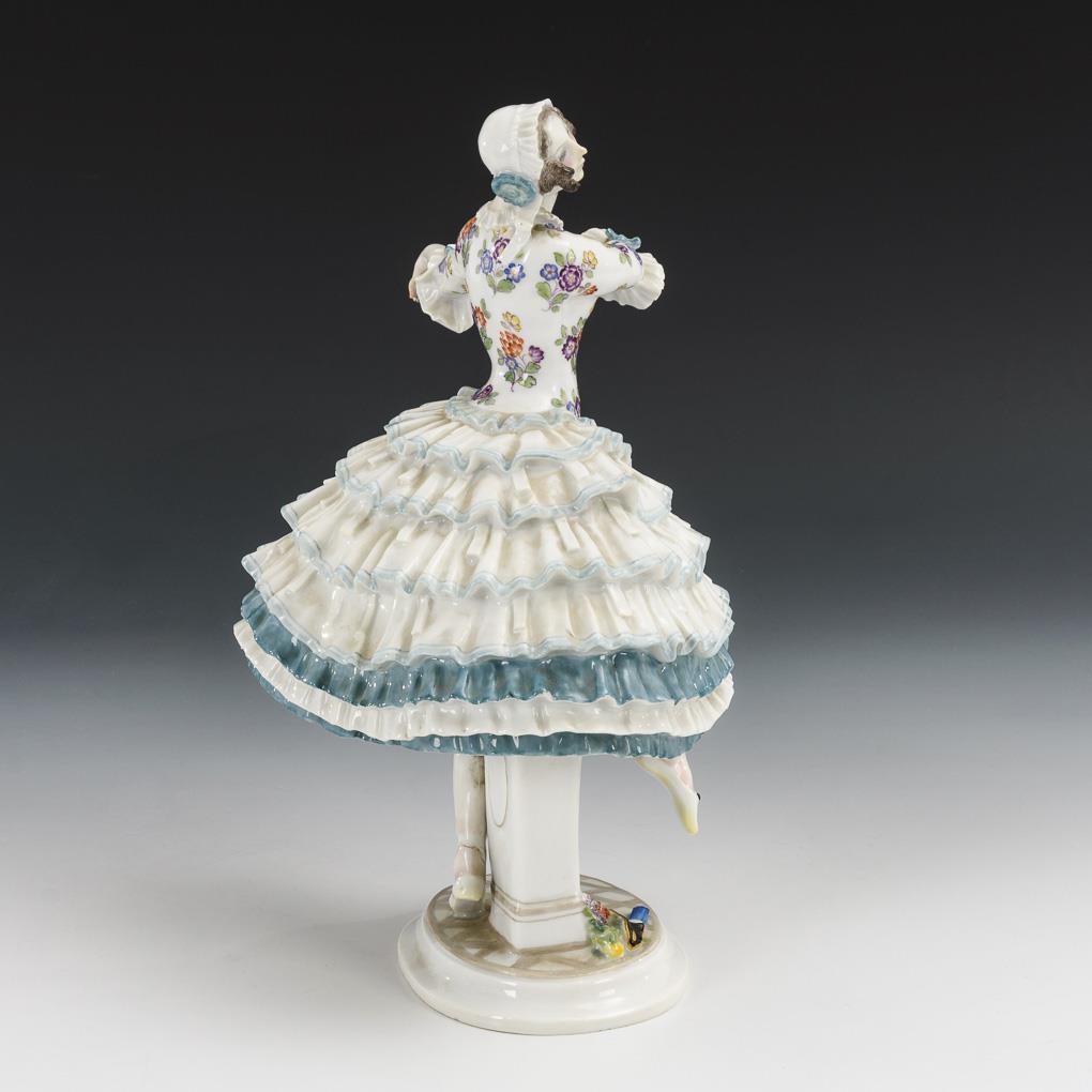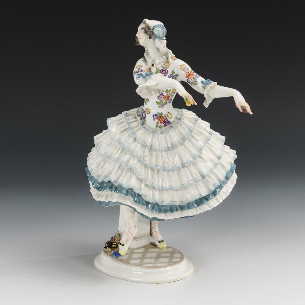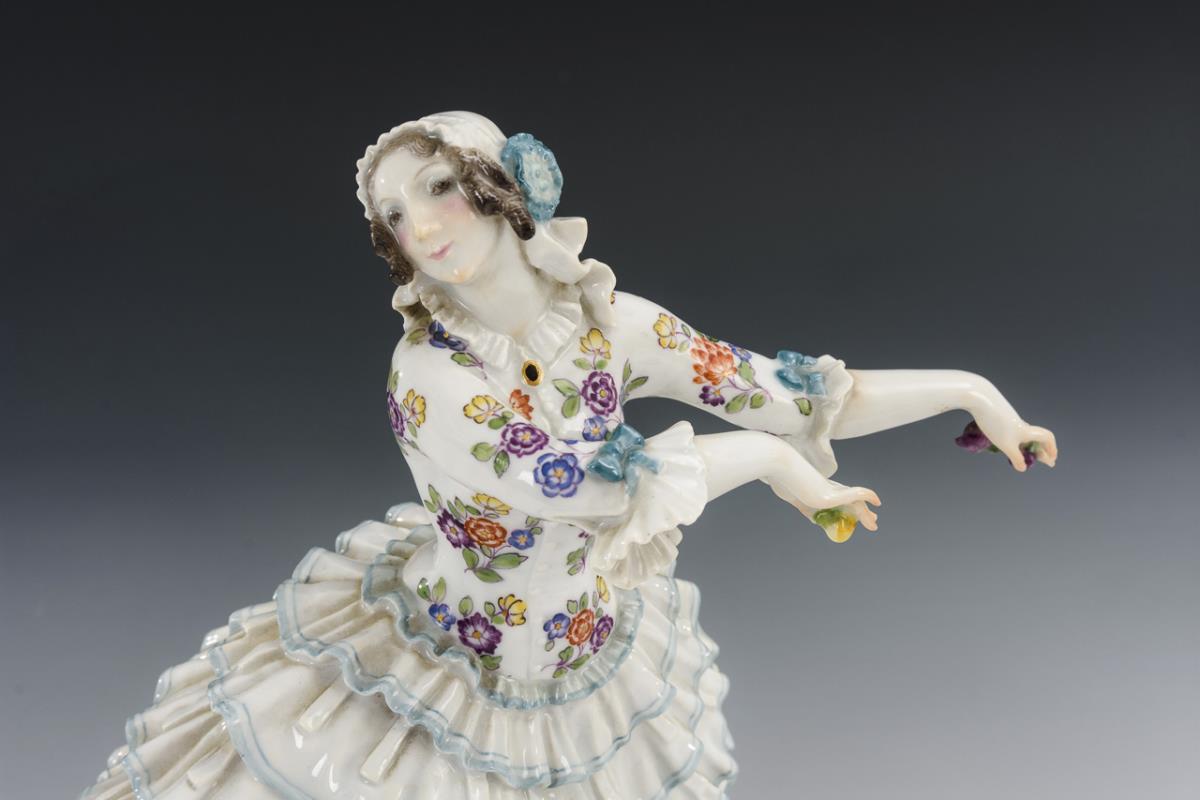 Russische Tänzerin aus dem Ballett "Karneval". In Tanzpose stehende junge Dame im Rüschenrock, zwei Blüten in der Hand haltend. Bestoßung an 1 Rüsche.
