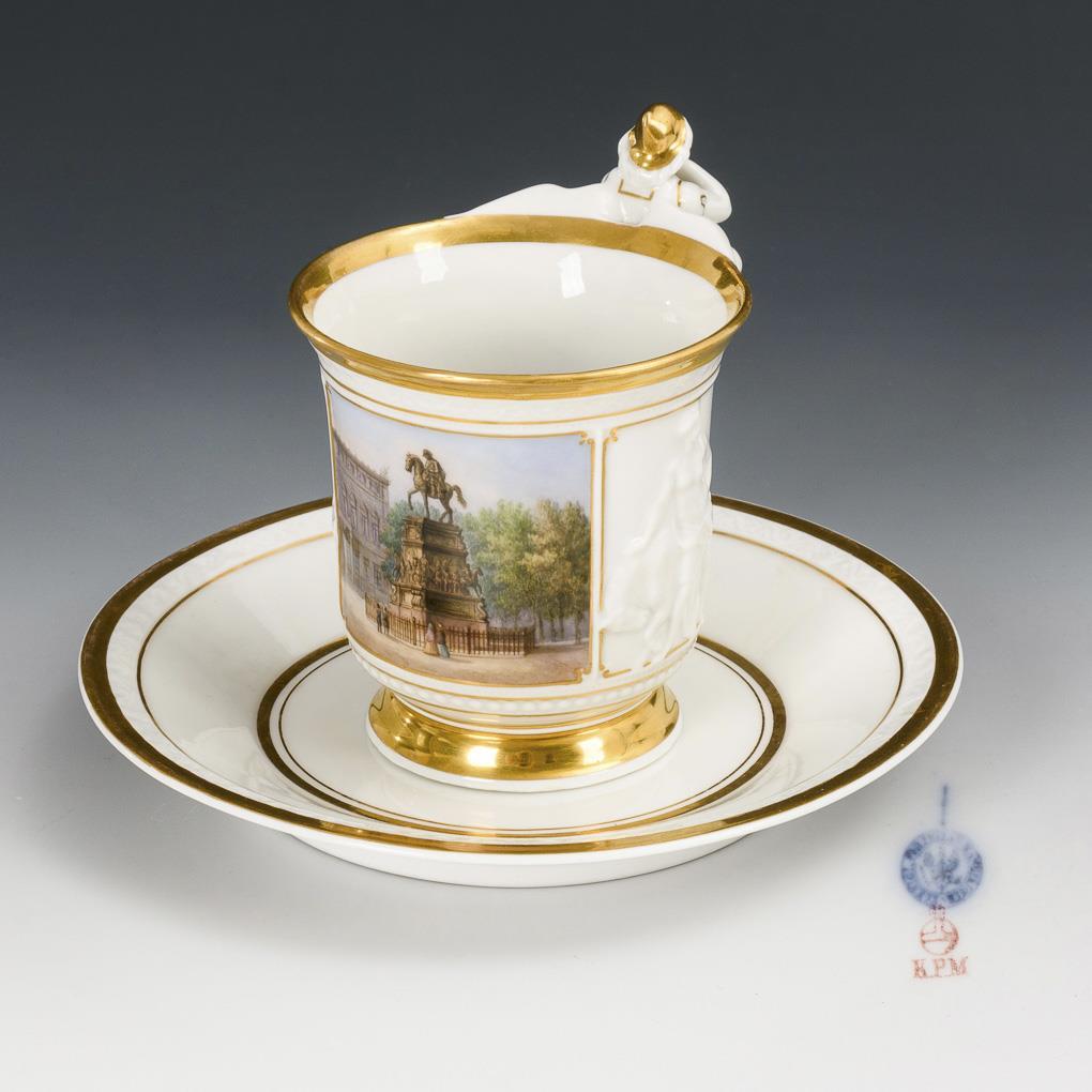 Gefußte Glockentasse mit einem Henkel in Form einer jugendlichen, geflügelten Figur mit Panzer und Schild auf Akanthusranken kniend, flankiert von den Reliefdarstellungen des Herkules mit Keule und Löwe sowie der Europa mit dem Stier. Schauseitig eine Rechteckkartusche mit der Ansicht des Reiterdenkmals Friedrichs des Großen Unter den Linden in Berlin. Minimale Bestoßung am Tassenstand, Chip unterseitig am Untertassenrand.