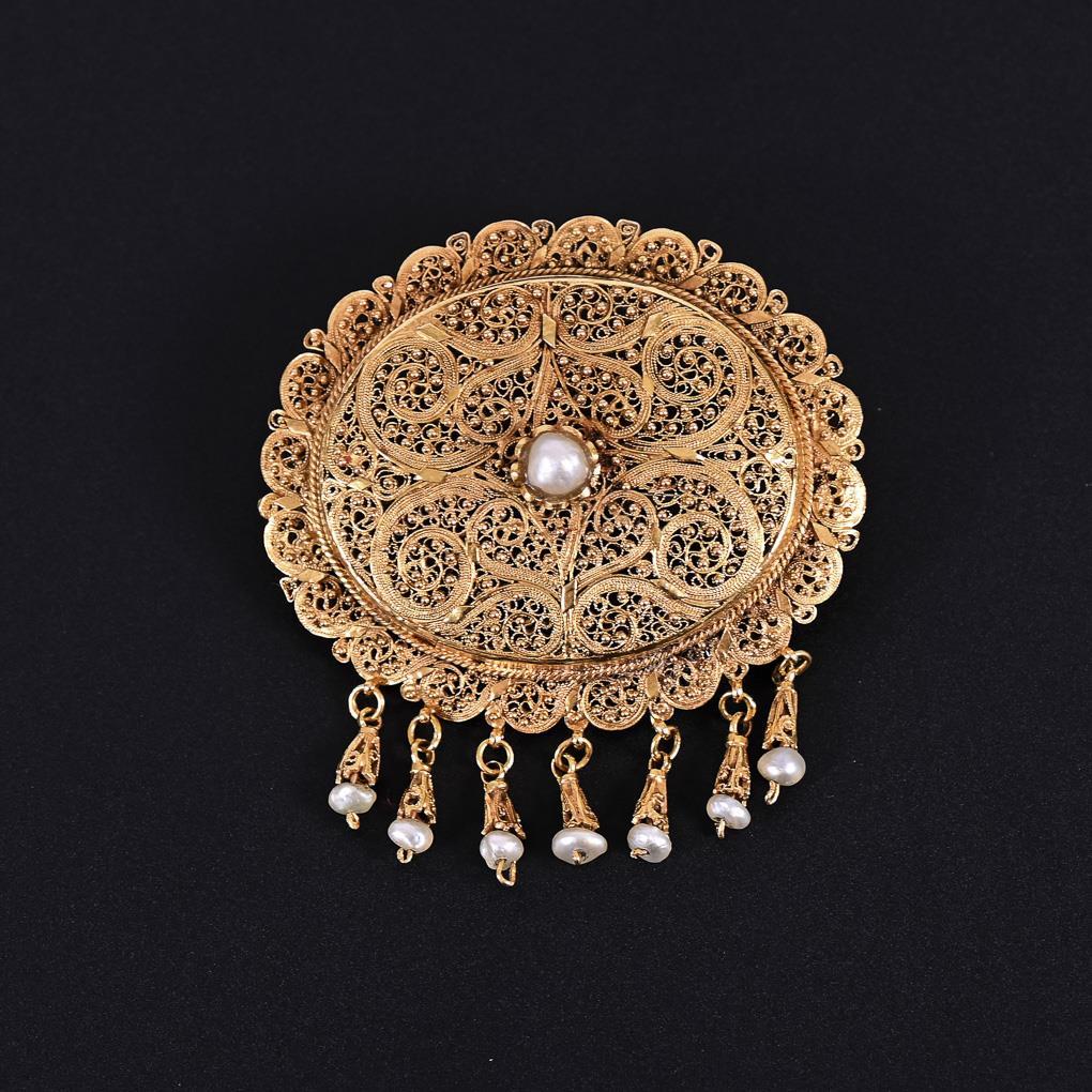 Filigranbrosche mit Perlchen, um 1900.