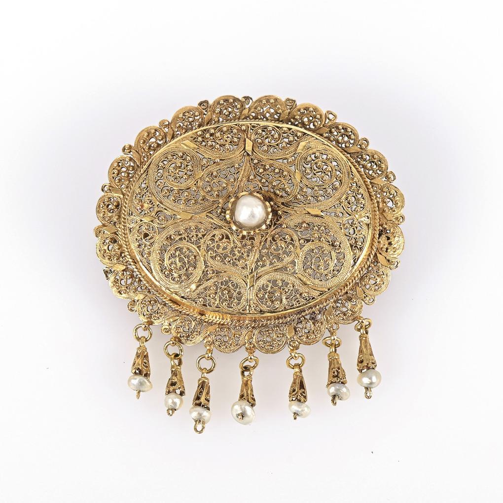 Filigranbrosche mit Perlchen, um 1900.