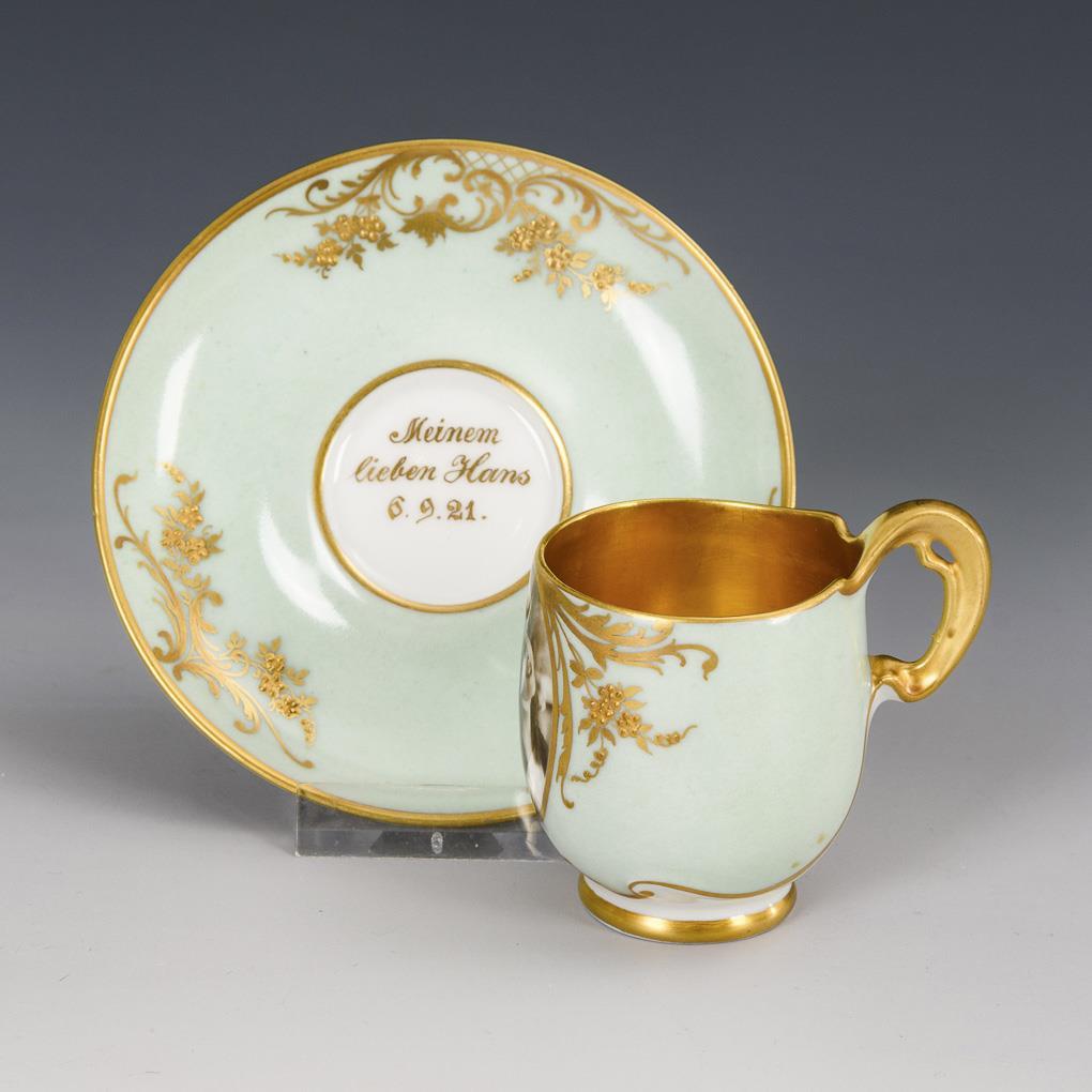 Ovoide Tasse mit geschwungenem Henkel. Schauseitig ein Ovalmedaillon mit dem Foto einer jungen Dame, im Spiegel der Untertasse die Widmung "Meinem lieben Hans 6.9.21", innen vergoldet.