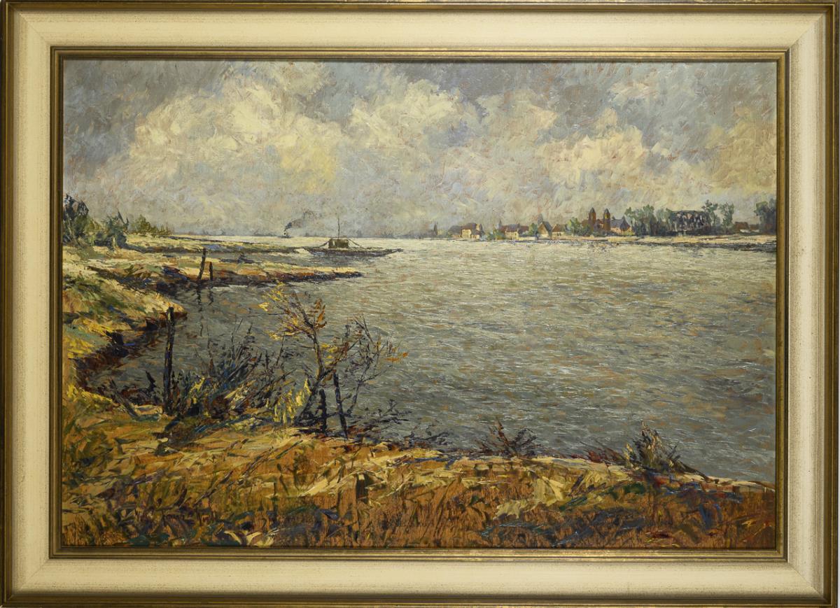 Blick vom Ufer über den Fluss zur Stadt auf der anderen Seite.