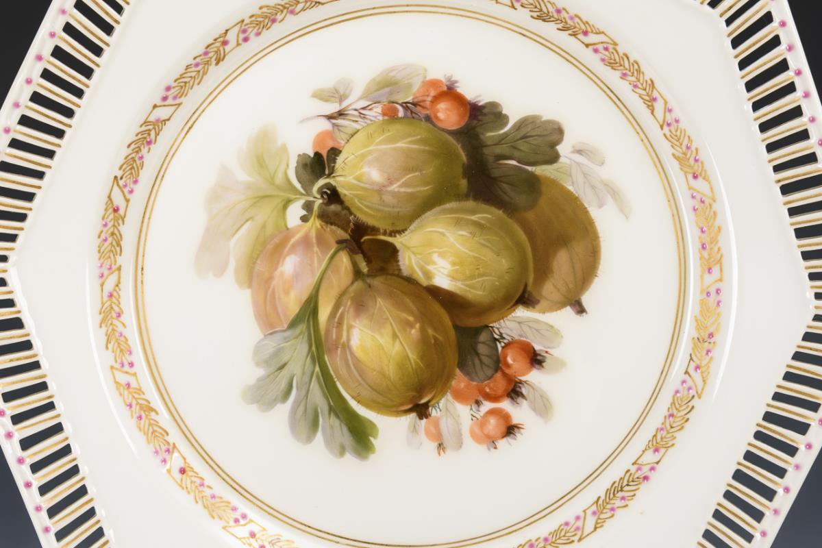 Oktogonale Teller mit stabdurchbrochener Fahne. Im Spiegel jeweils ein im Stil der Weichmalerei gemaltes Obstbukett.