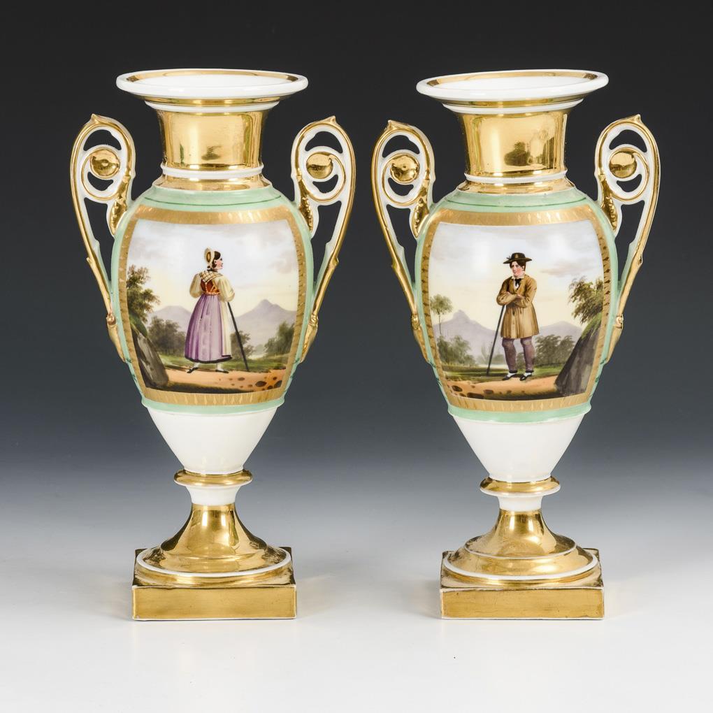 Ovoider Korpus, zwei Rosettenhenkel, Kraterhals, Rundfuß, auf Quadratplinthe. Hellgrüner Fond, schauseitig eine goldgerahmte Rechteckkartusche mit der Darstellung eines Bauern bzw. einer Bäuerin in Trachtenkleidung in einer Berglandschaft, verso Blumenmalerei. Minimaler Goldabrieb, Korpusansatz jeweils restauriert.