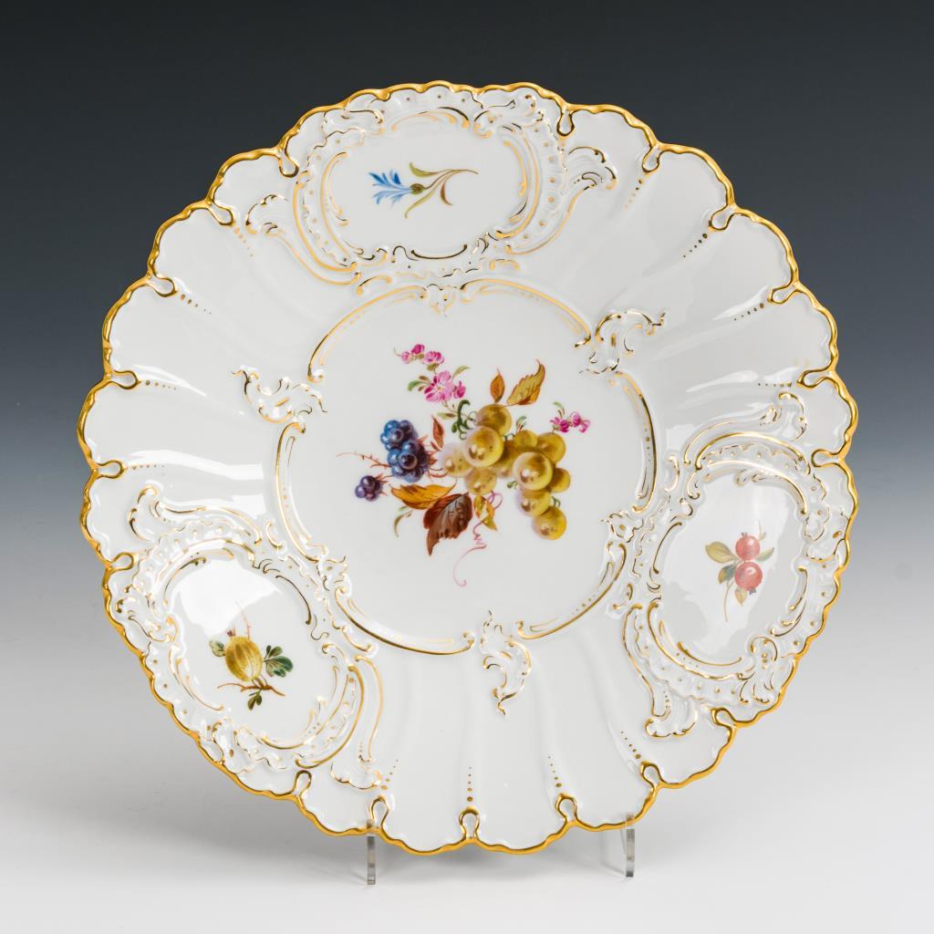 Teller mit muschelartig reliefierter Fahne und drei Rocailleschildern.