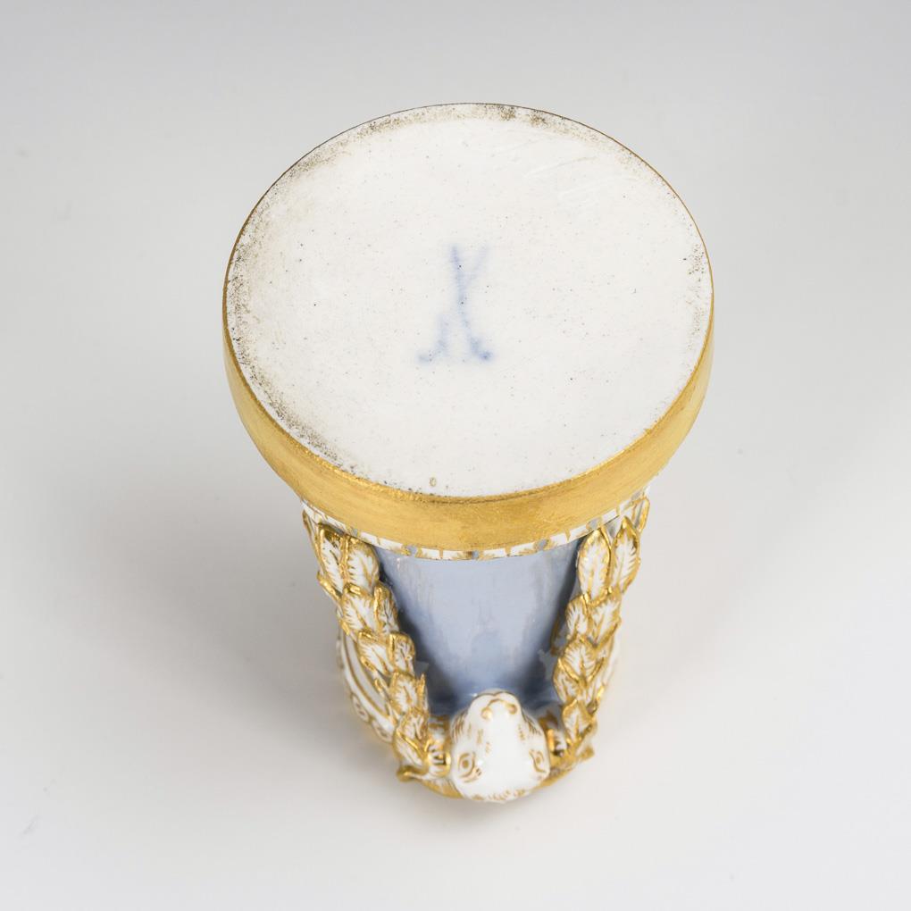 Vase in Form eines Säulenstumpfes mit zwei Widderköpfen und Lorbeerlaubgirlanden. Hellblauer Fond, schauseitig ein kleines, goldrocaillegerahmtes Medaillon mit Watteau-Malerei in Purpurcamaieu.