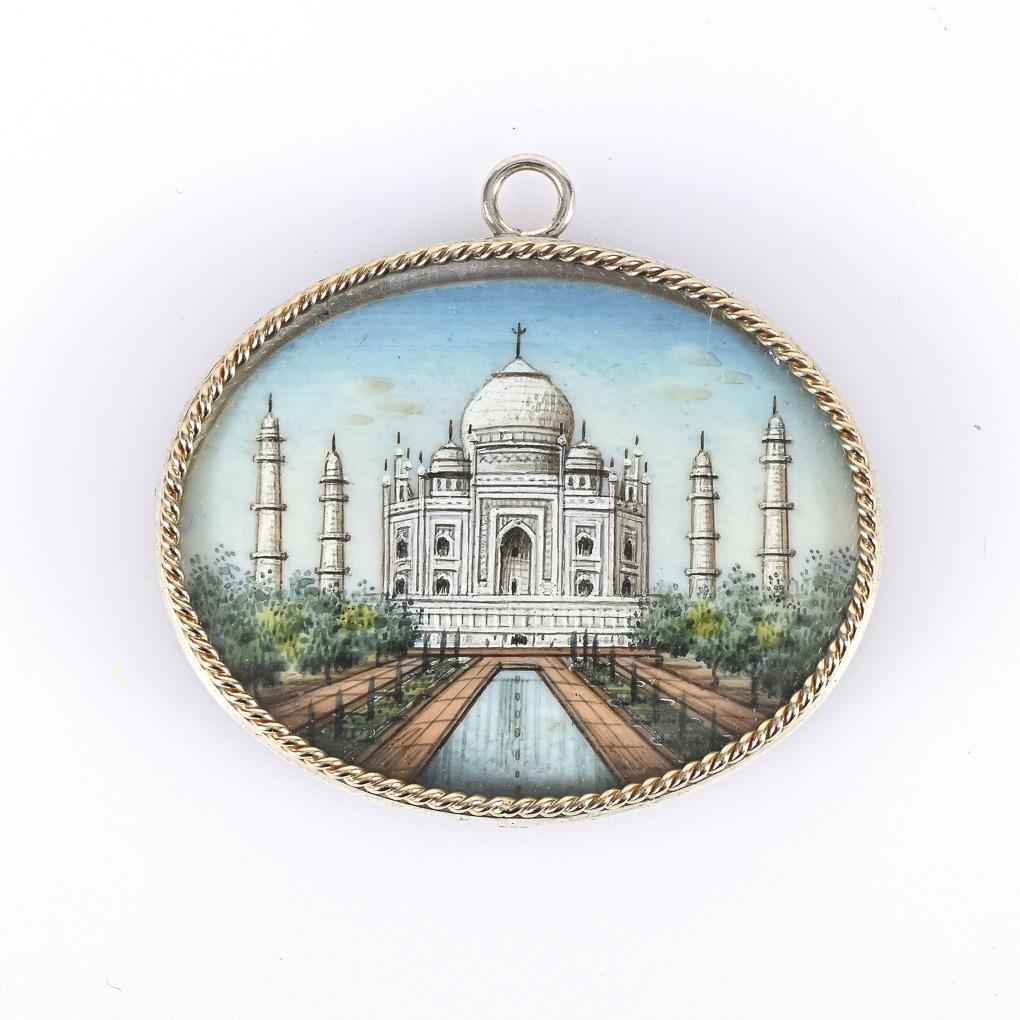 Verglastes, gemaltes Motiv des indischen Grabgebäudes. Zargenfassung mit Rückplatte und Spannring. Starre Öse.